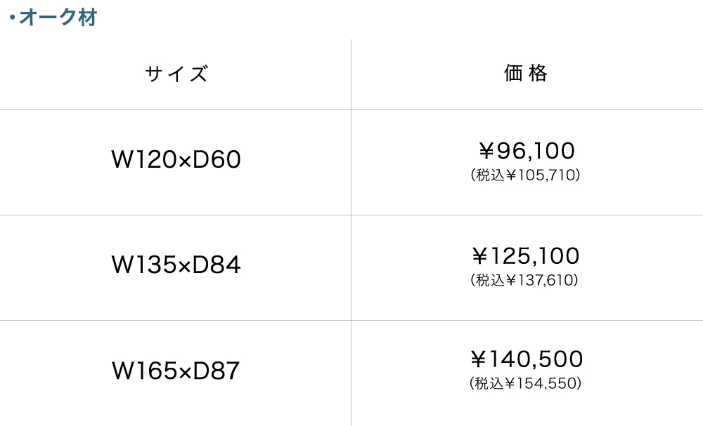 樹種はウォールナット材・ブラックチェリー材・オーク材・メープル材の4種類から、サイズは幅120cm、幅135cm、幅165cmの3サイズから、お好みに合わせてお選びいただけます。