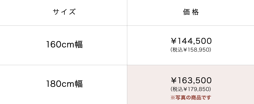 幅は160cmと180cmの2サイズからお好みに合わせてお選びいただけます。
