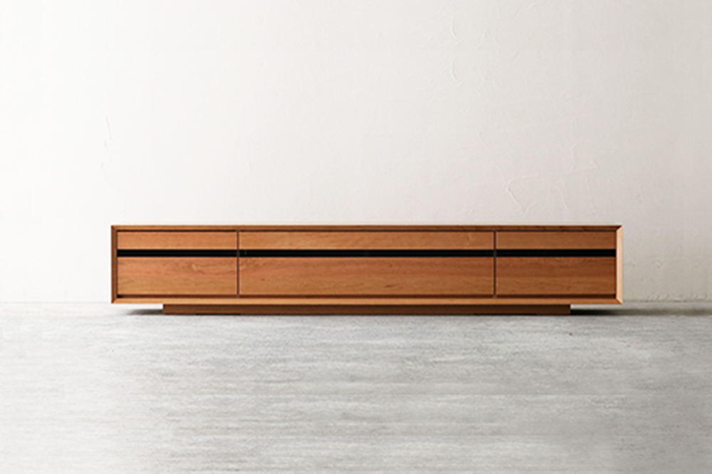 ブラックチェリーの木目とすっと通った窓がおしゃれな高級感のあるブラックチェリー材のテレビボード。