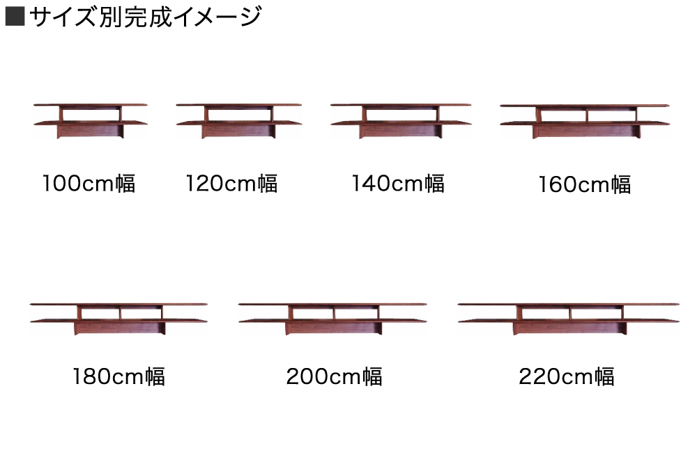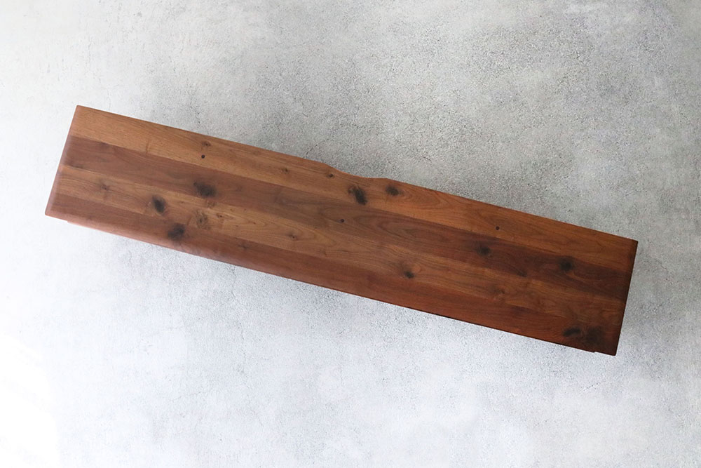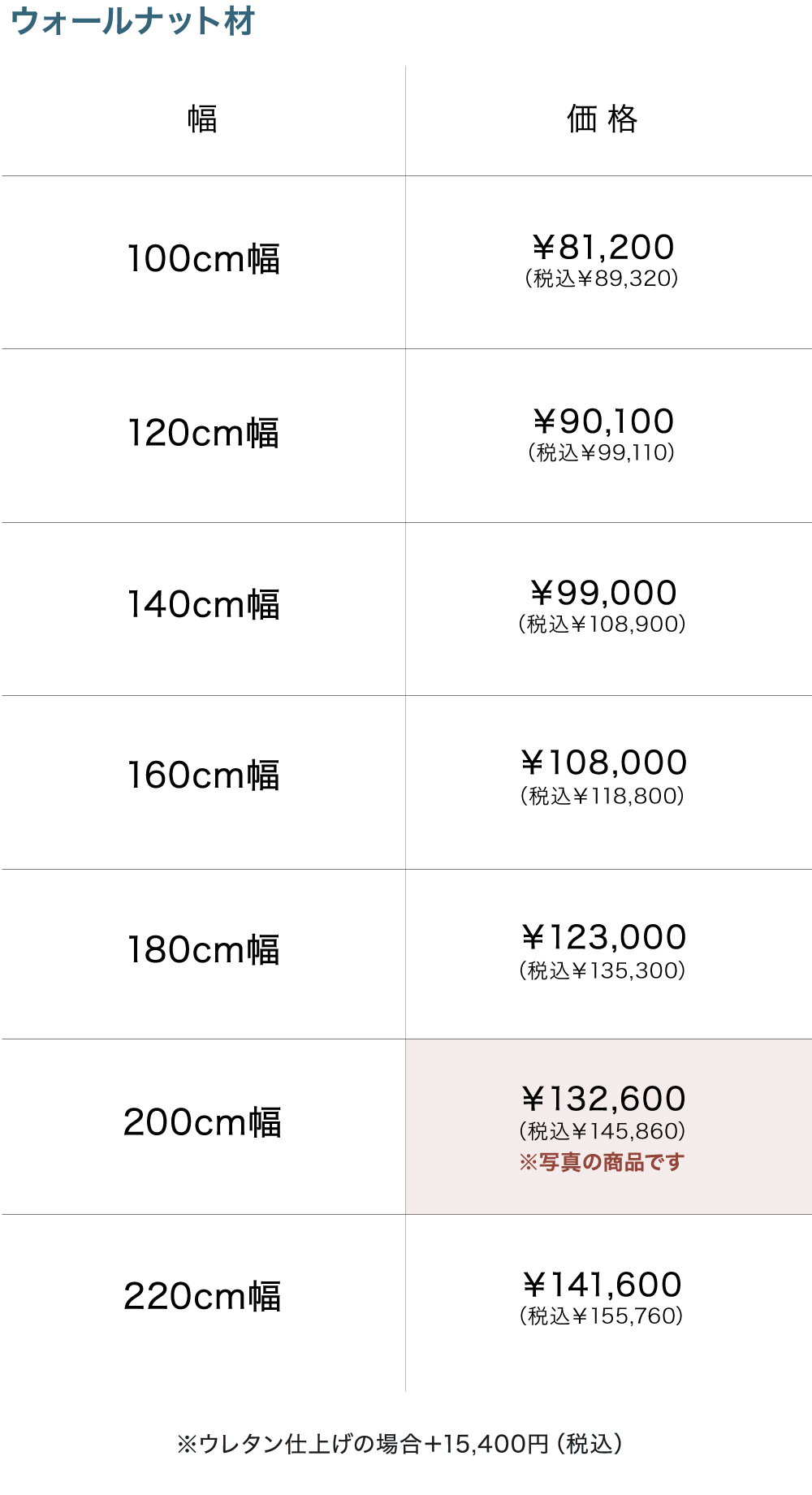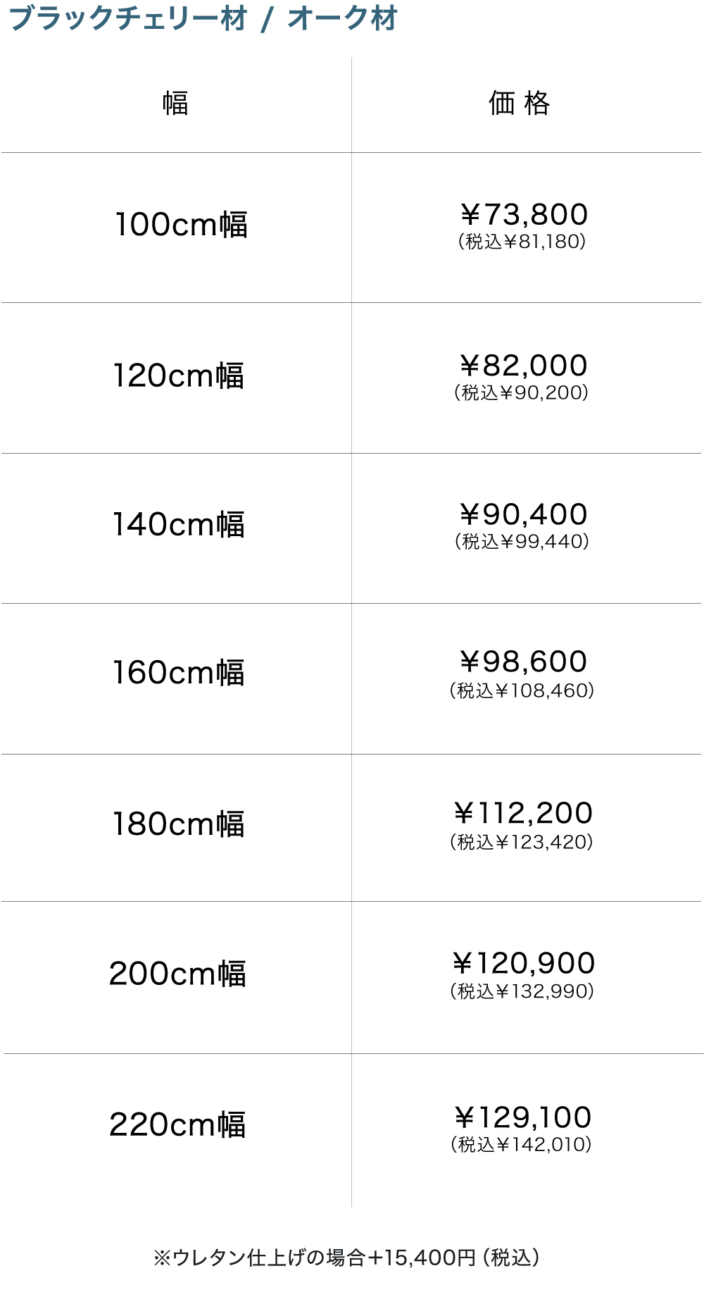 樹種はウォールナット材・ブラックチェリー材・オーク材の3種類から、幅は100cmから220cmまで、塗装はオイル仕上げとウレタン仕上げの2種類からお好みに合わせてお選びいただけます。