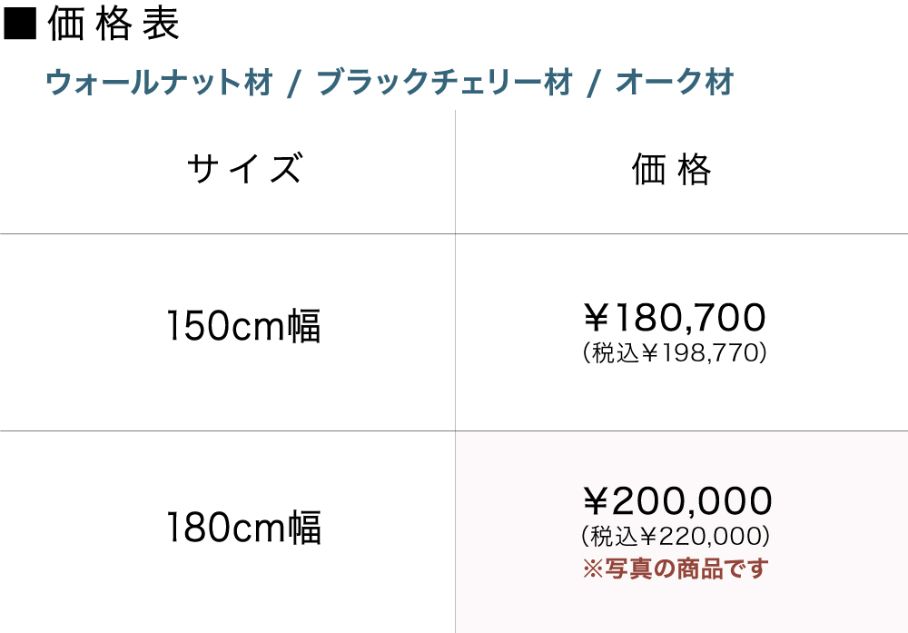 樹種はウォールナット材・ブラックチェリー材・オーク材の3種類から、幅は150cm・180cmの2サイズからお好みに合わせてお選びいただけます。