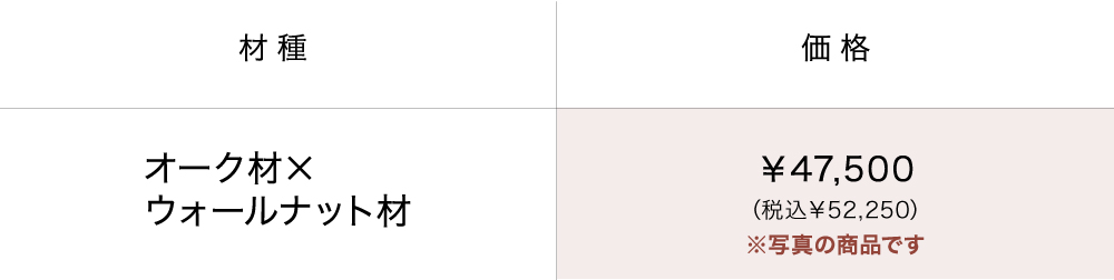 | 仕 様 | 天板:オーク無垢材 脚:ウォールナット無垢材 |