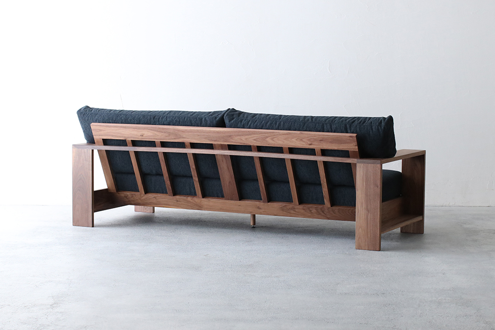 背面のクッションがアームまで伸びた特徴的なデザインになっております。