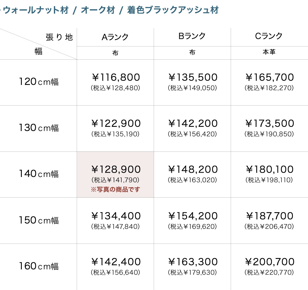 【120cm幅】 128,480円(税込価格)〜 116,800円(本体価格)〜 【130cm幅】 135,190円(税込価格)〜 122,900円(本体価格)〜 【140cm幅】 141,790円(税込価格)〜 128,900円(本体価格)〜 【150cm幅】 147,840円(税込価格)〜 134,400円(本体価格)〜 【160cm幅】 156,640円(税込価格)〜 142,400円(本体価格)〜 【170cm幅】 164,010円(税込価格)〜 149,100円(本体価格)〜 【180cm幅】 169,290円(税込価格)〜 153,900円(本体価格)〜 【190cm幅】 176,440円(税込価格)〜 160,400円(本体価格)〜 |