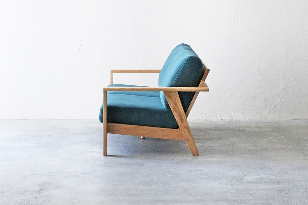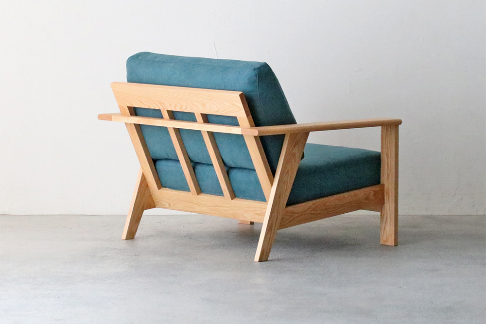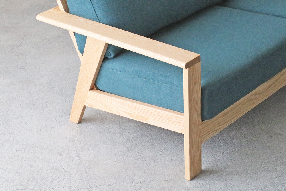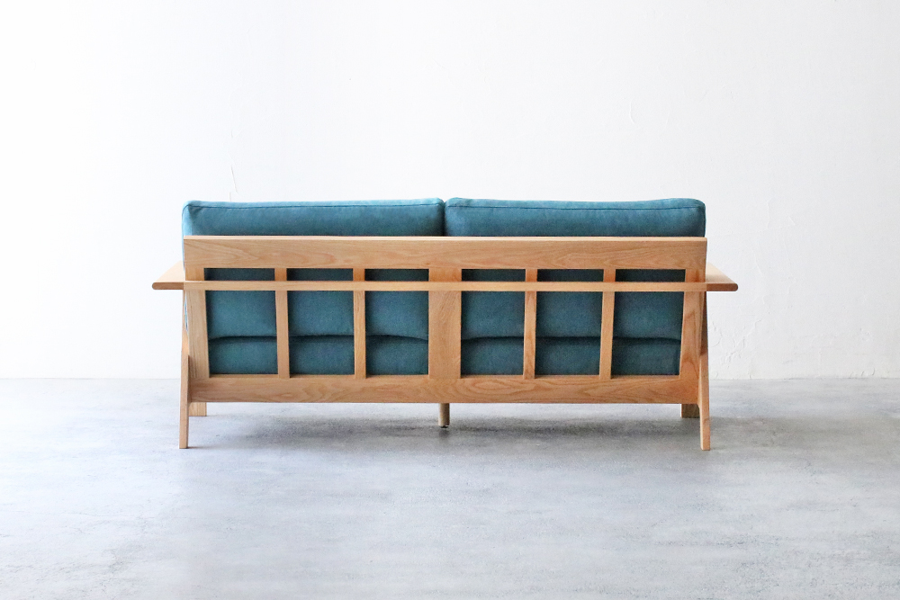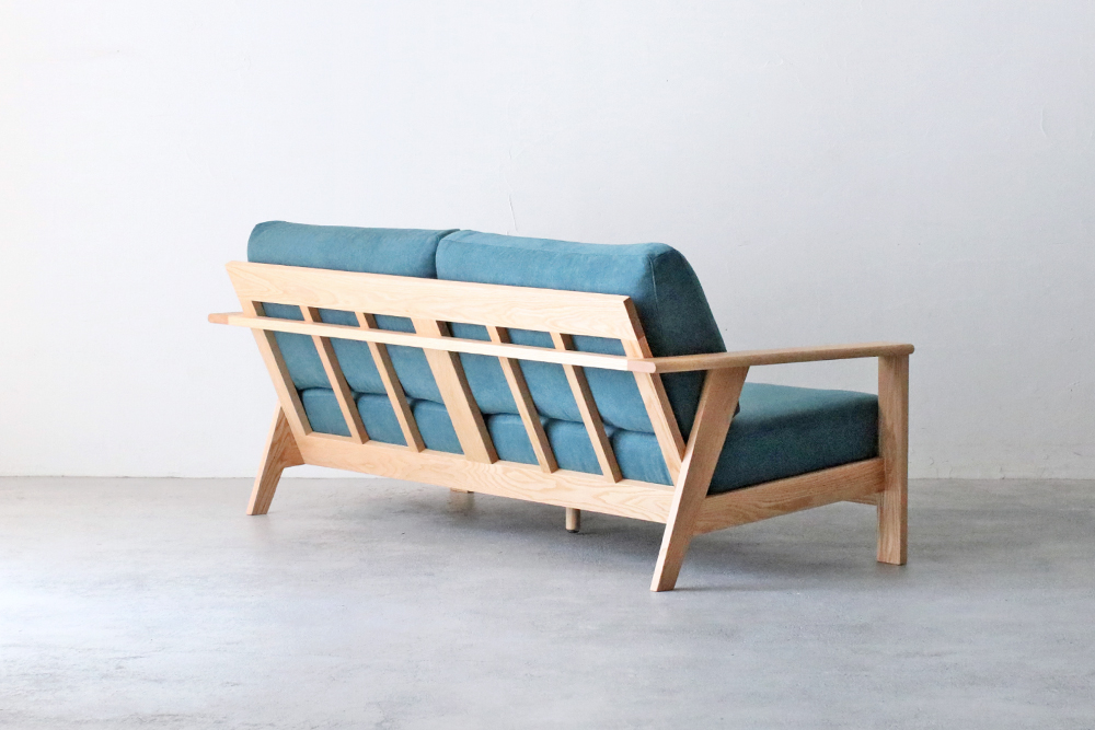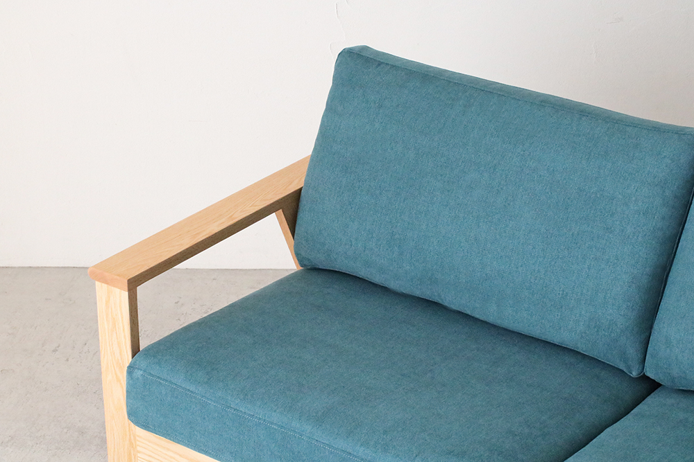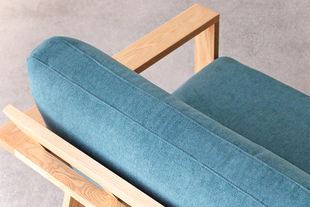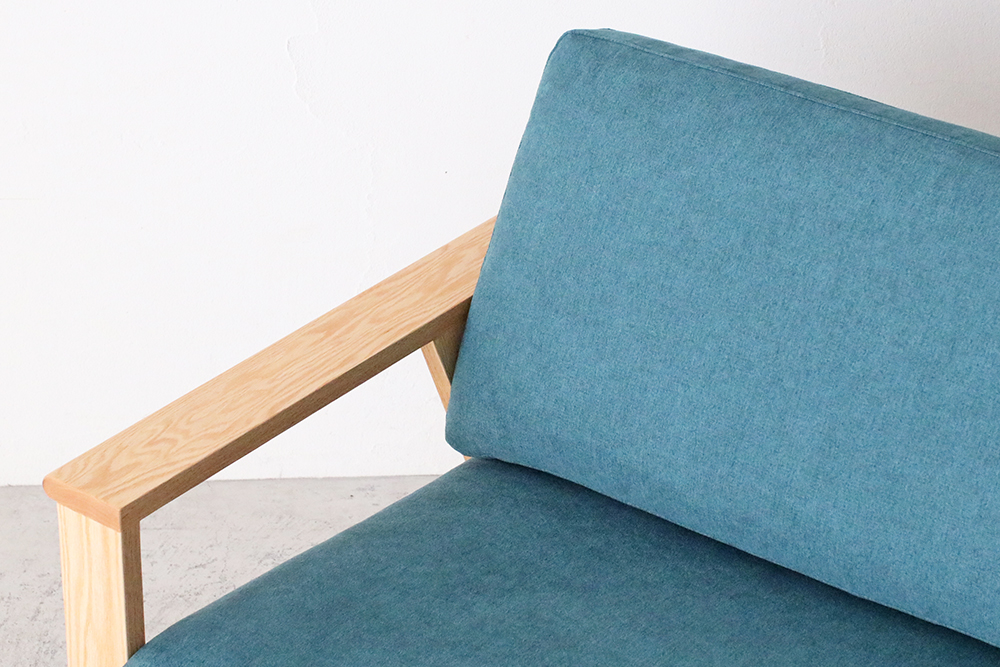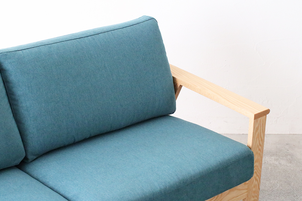 肘掛け部分は外側の角が丸くデザインされ、なめらかな触り心地です。後ろから見ても直線的なラインを活かしたデザインで、お部屋の間仕切りのようにソファを置かれる方にはおすすめのソファです。