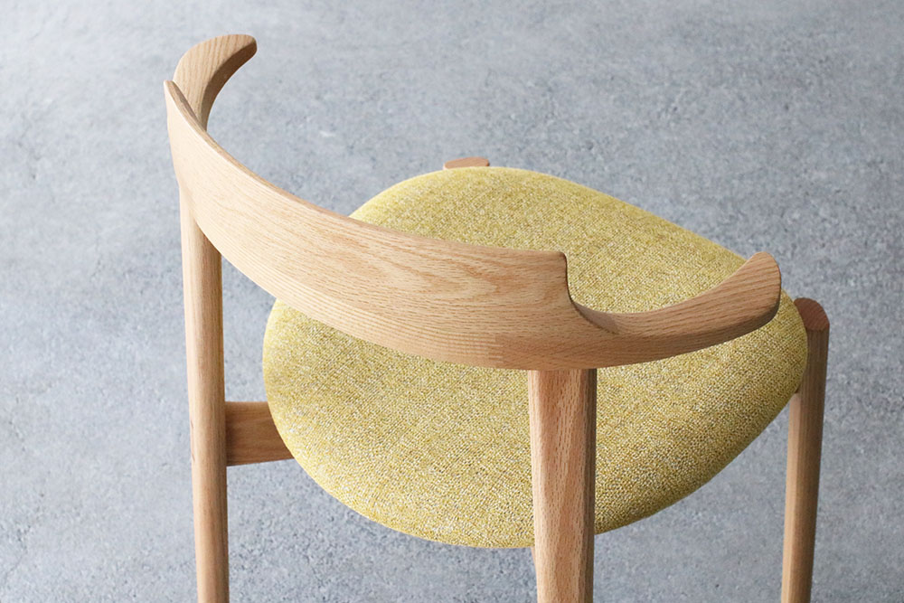 包み込まれるように背から繋がったアームが特徴的なチェア。