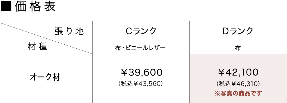 樹種はオーク材RFO色(ナチュラル)・オーク材MC色(ダークブラウン)・オーク材BK色(ブラック)の3種類から、張り地は28種類からお好みに合わせてお選びいただけます。