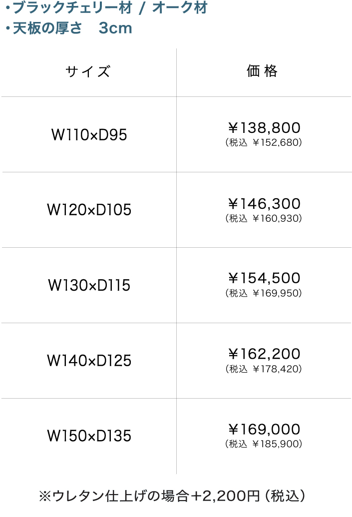 樹種はウォールナット材・ブラックチェリー材・オーク材の3種類から、サイズは110cmから150cmの5サイズから、塗装はオイル仕上げとウレタン仕上げの2種類からお好みに合わせてお選びいただけます。