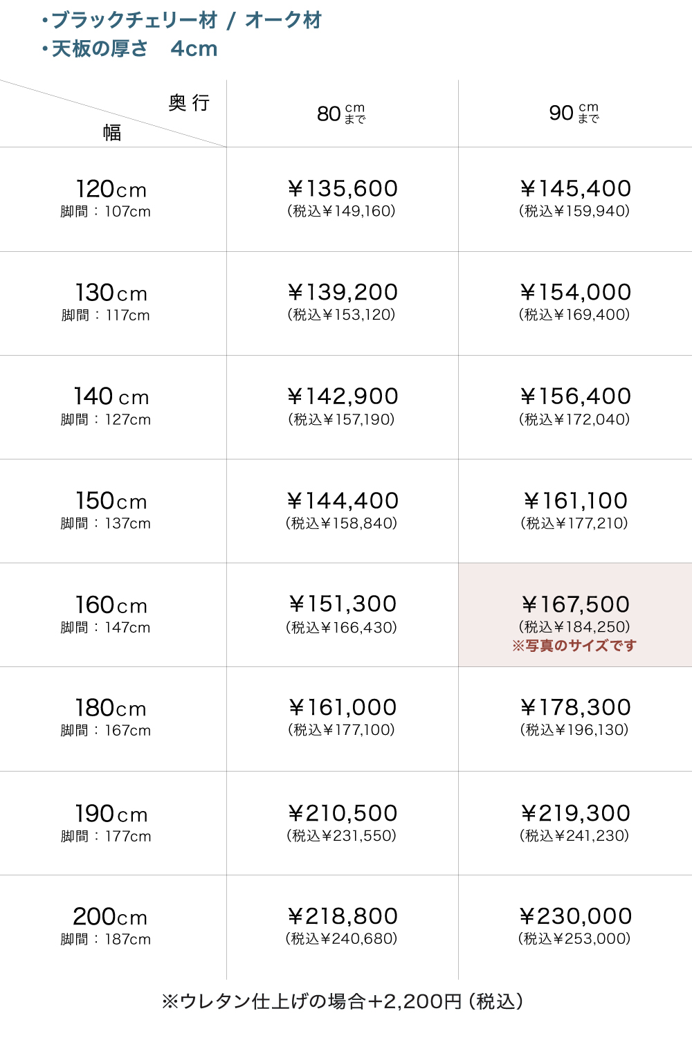 樹種はウォールナット材・ブラックチェリー材・オーク材の3種類から、幅は120cmから200cmまで、奥行は80cmと90cmから、塗装はオイル仕上げとウレタン仕上げの2種類からお好みに合わせてお選びいただけます。