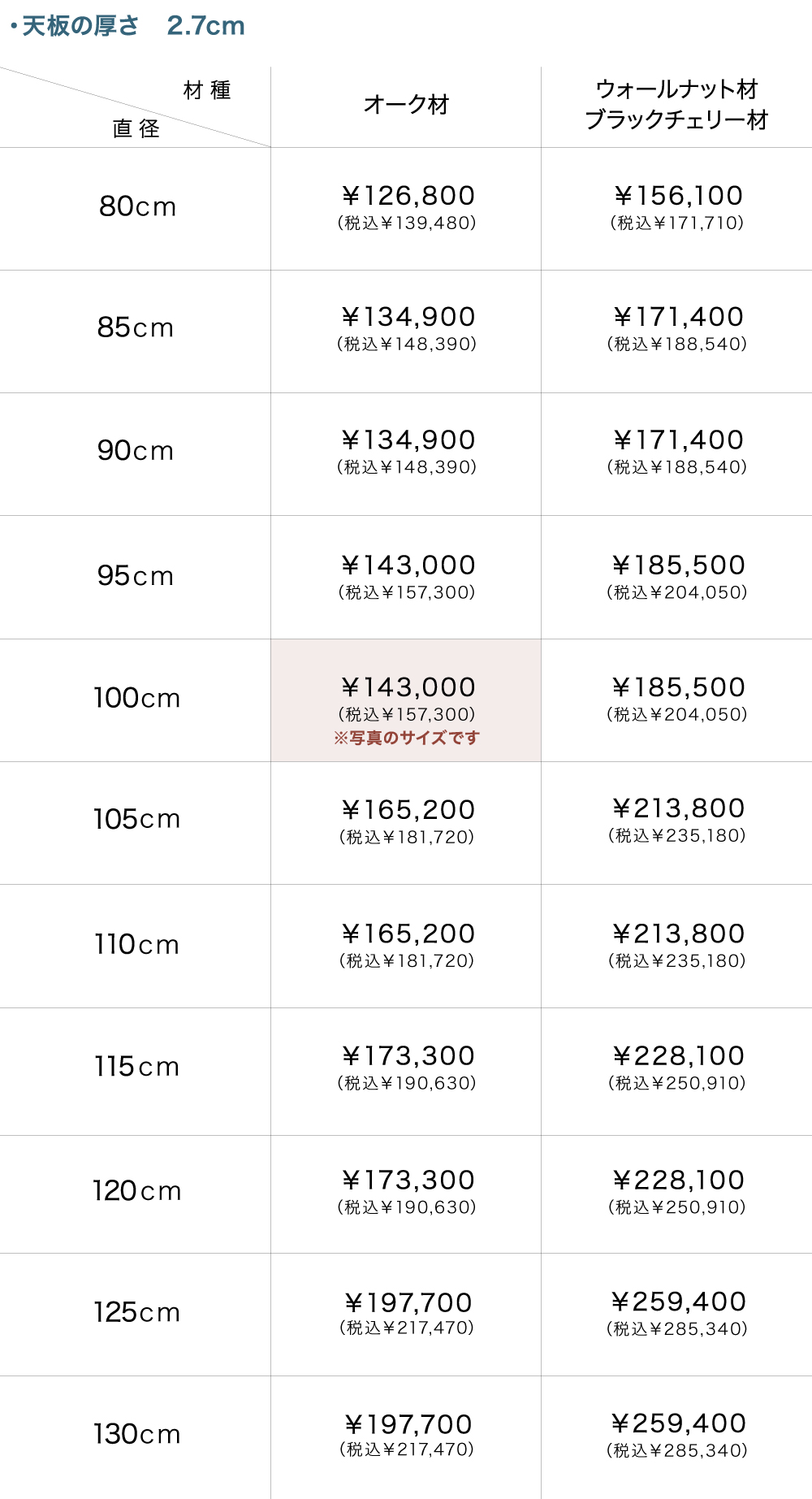 | サイズ | φ100xH70(cm) 天板厚:2.7(cm) ※天板の直径は80㎝から130㎝までお部屋に合わせてお選びいただけます。 |