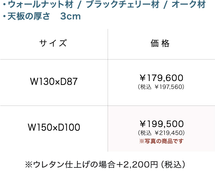 樹種はウォールナット材・ブラックチェリー材・オーク材の3種類から、サイズは幅150cmと幅130cmの2サイズから、塗装はオイル仕上げとウレタン仕上げの2種類からお好みに合わせてお選びいただけます。