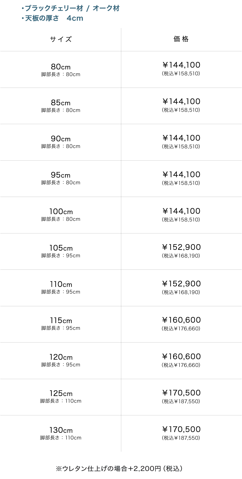 樹種はウォールナット材・ブラックチェリー材・オーク材の3種類から、サイズは直径80cmから130cmまで、塗装はオイル仕上げとウレタン仕上げの2種類からお好みに合わせてお選びいただけます。