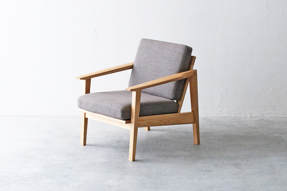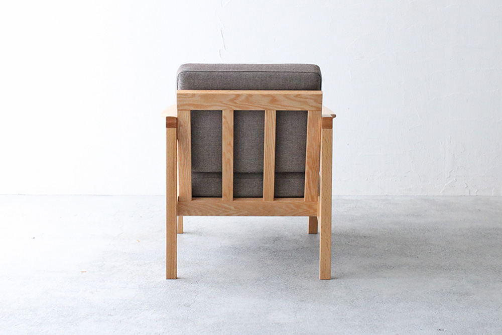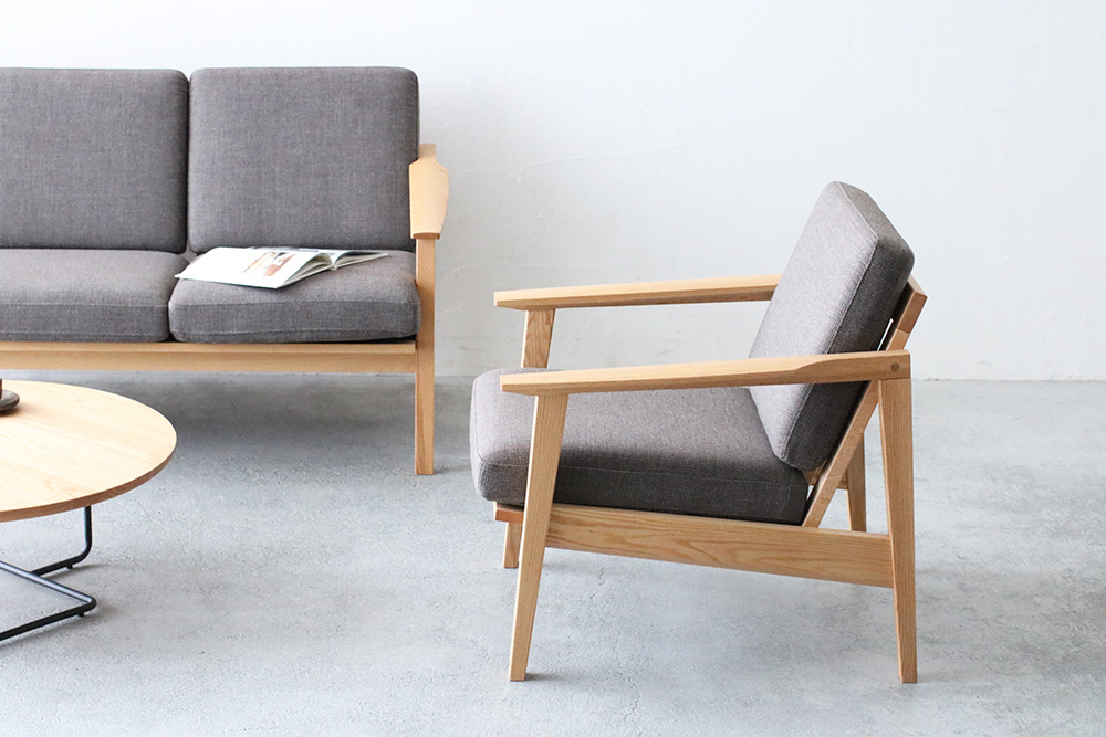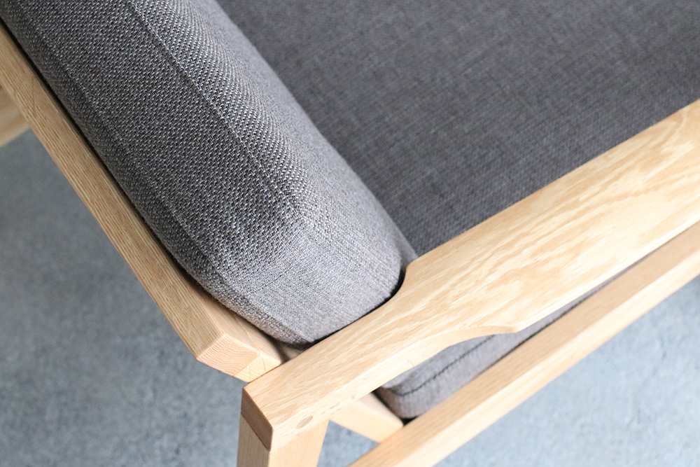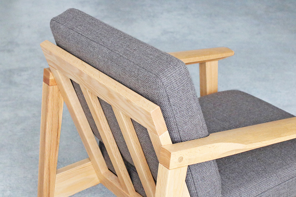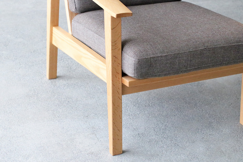 脚にはオーク材の特徴の「虎斑」が見られ、細身のデザインながらも天然木のぬくもりを感じまます細身のフレームデザインのコンパクトな1人掛けのソファ。