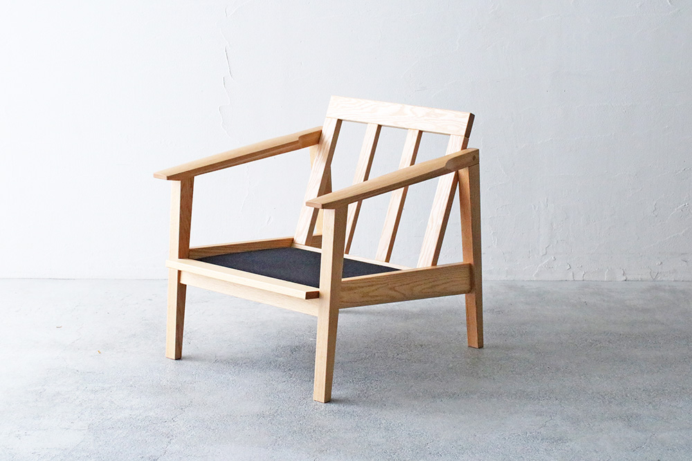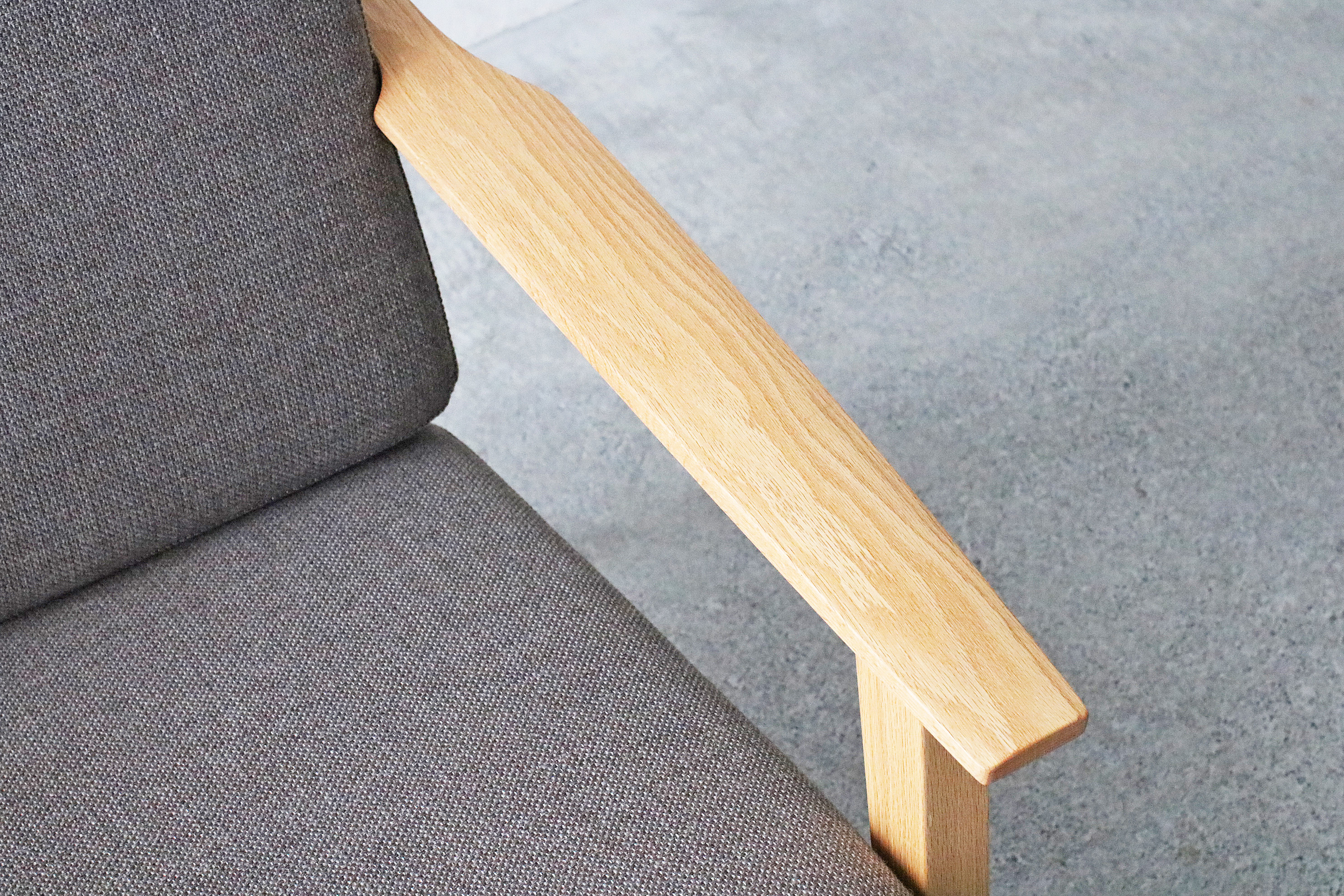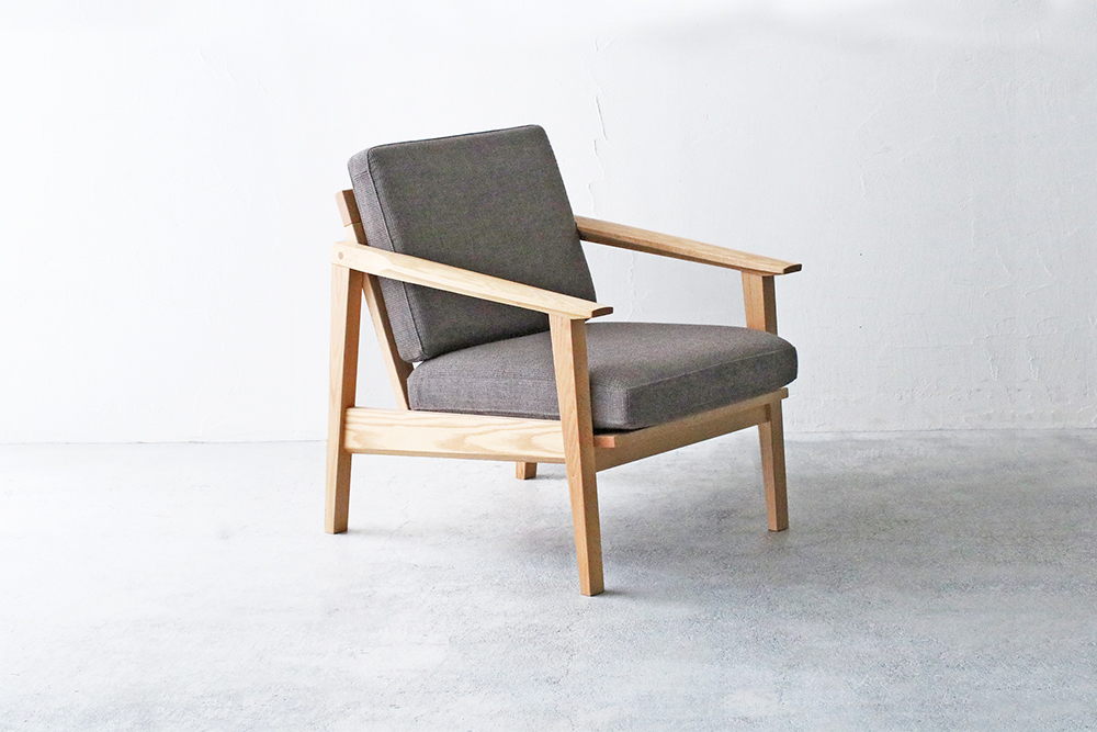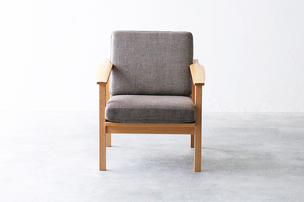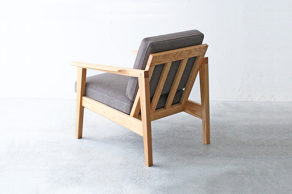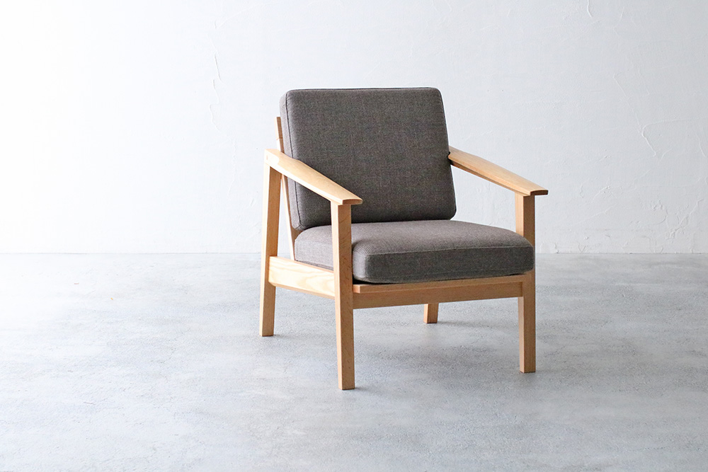 脚にはオーク材の特徴の「虎斑」が見られ、細身のデザインながらも天然木のぬくもりを感じまます細身のフレームデザインのコンパクトな1人掛けのソファ。