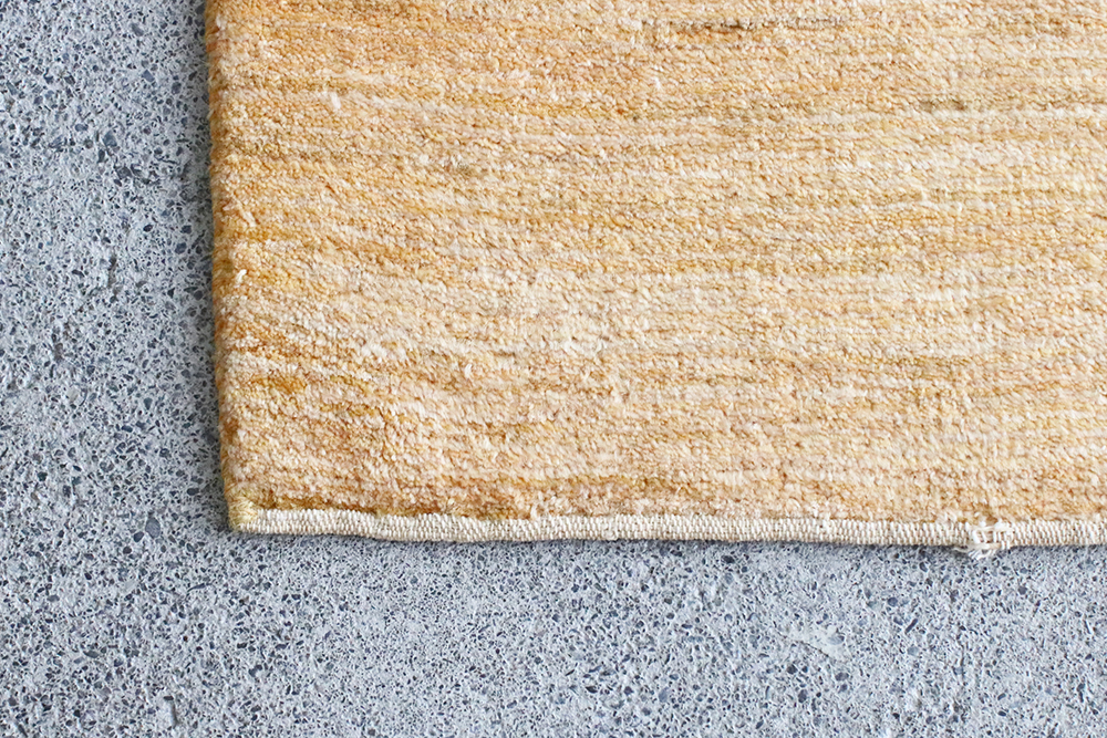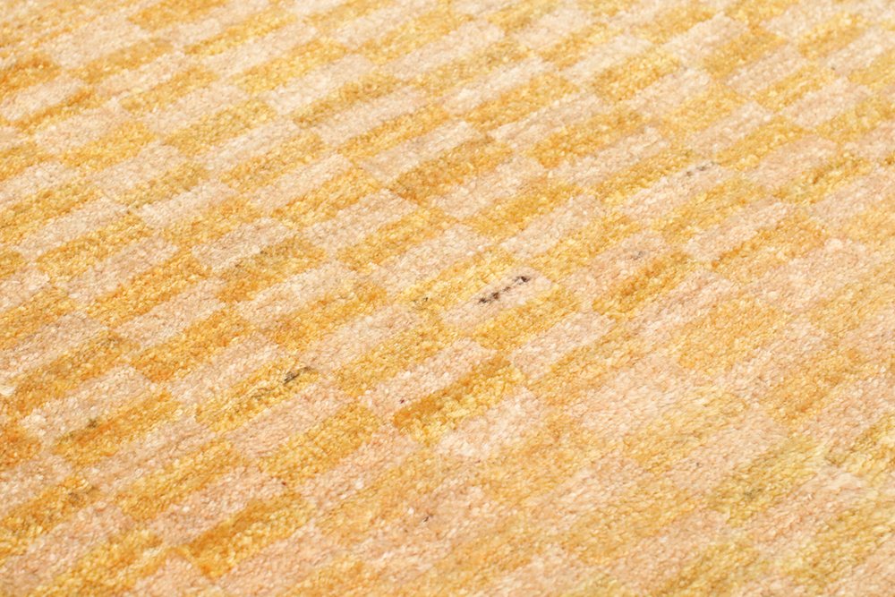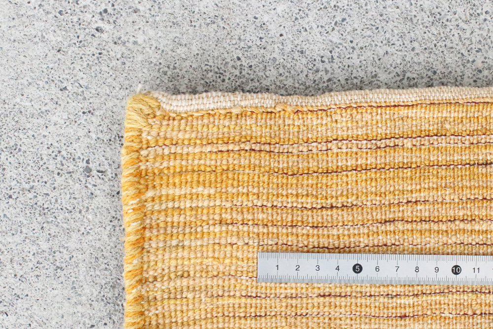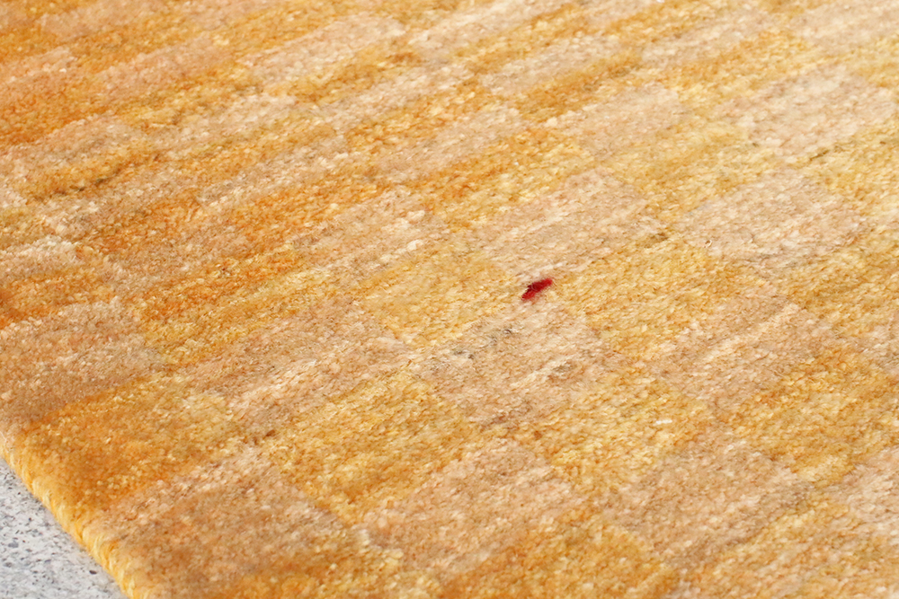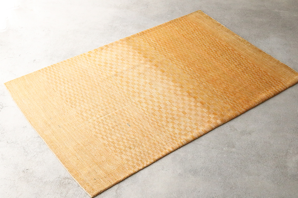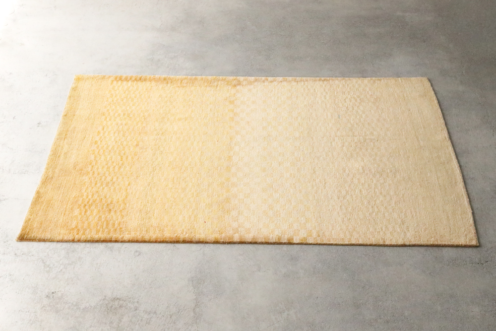 ところどころ赤や青の糸が織り込まれた感性豊かなギャッベです黄色をベースに、幾つもの長方形が規則的に織り込まれた一枚。