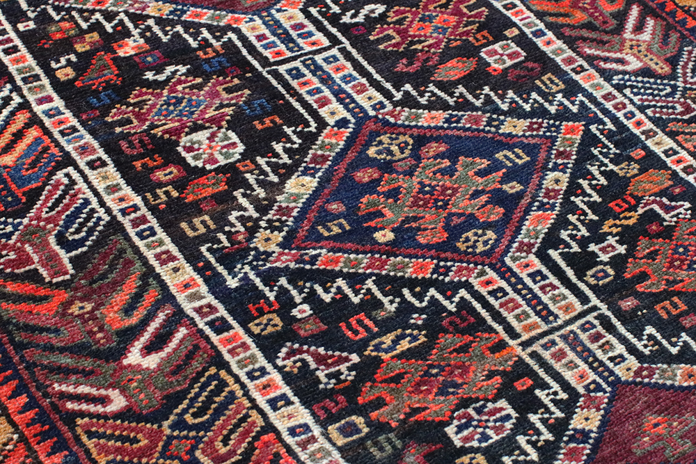 シラーズの絨毯は、カシュガイ族やその他の部族が織る幾何学模様の絨毯。自然からインスピレーションを得たデザインが特徴です。赤やオレンジを基調とした色合いが多く、中央にメダリオン(ひし形や六角形の模様)が配置されるものが特徴です。