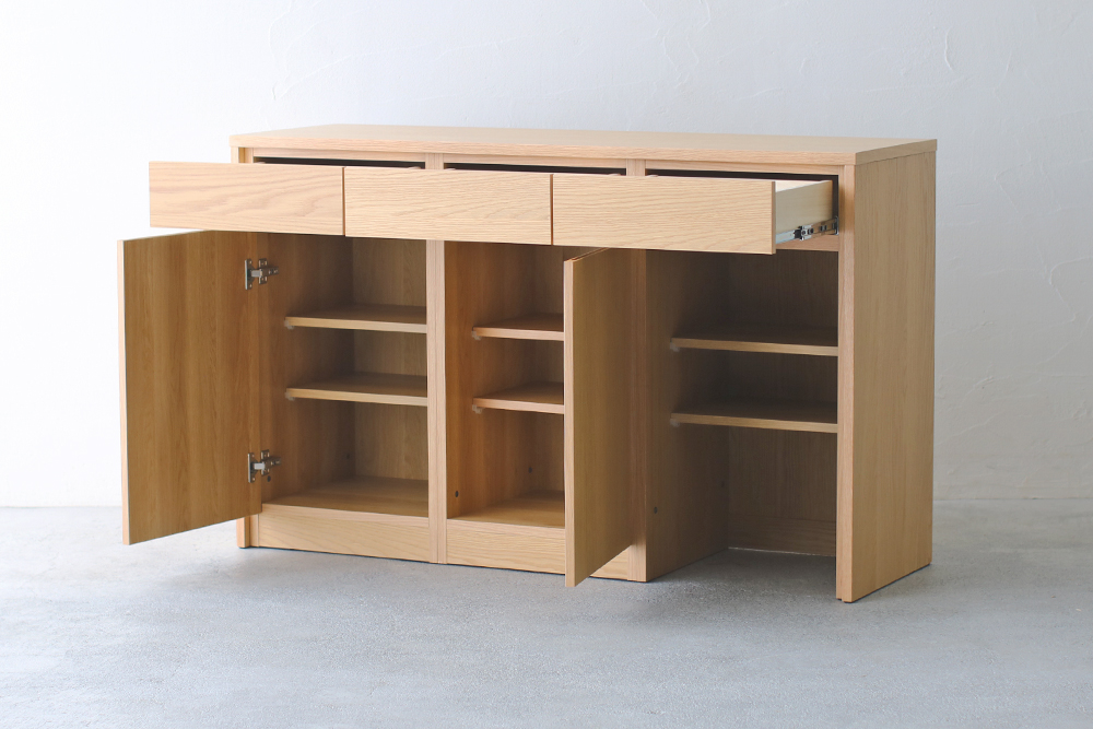 | サイズ | W136.4×D44.5×H85(cm) 天板厚:2.5(cm) 左扉内寸:W40×D40.5×H57.3(cm) 右扉内寸:W40×D40.5×H57.3(cm) オープンスペース内寸:W40×D40.5×H66(cm) 引き出し内寸:W34.4×D32×H7.5(cm) |
