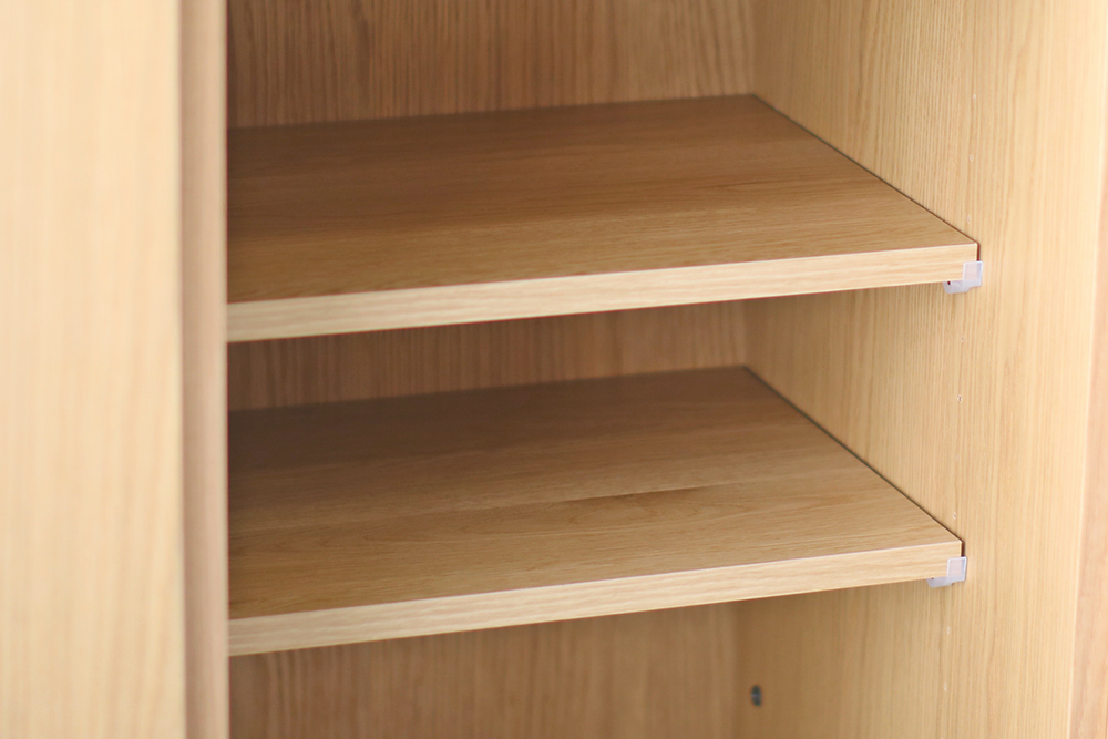棚板は6枚ついており、高さは収納物に合わせて、3cmピッチで12段階の調整ができます。3杯の引き出しはスライドレール付きなので出し入れがスムーズに出来ます。
