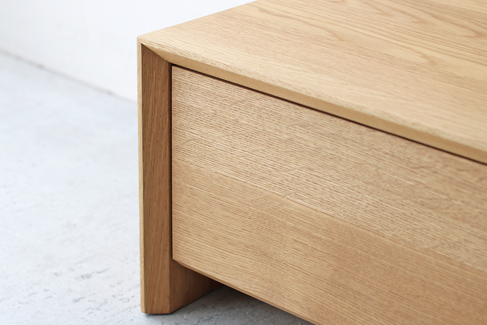 小口がテーパー加工された天板、側板を留め加工でつないだ門型のフォルムから「MON」と名付けられました。引出しは、釘などの金物は一切使わず、伝統の匠の技「蟻組工法」で作られています。