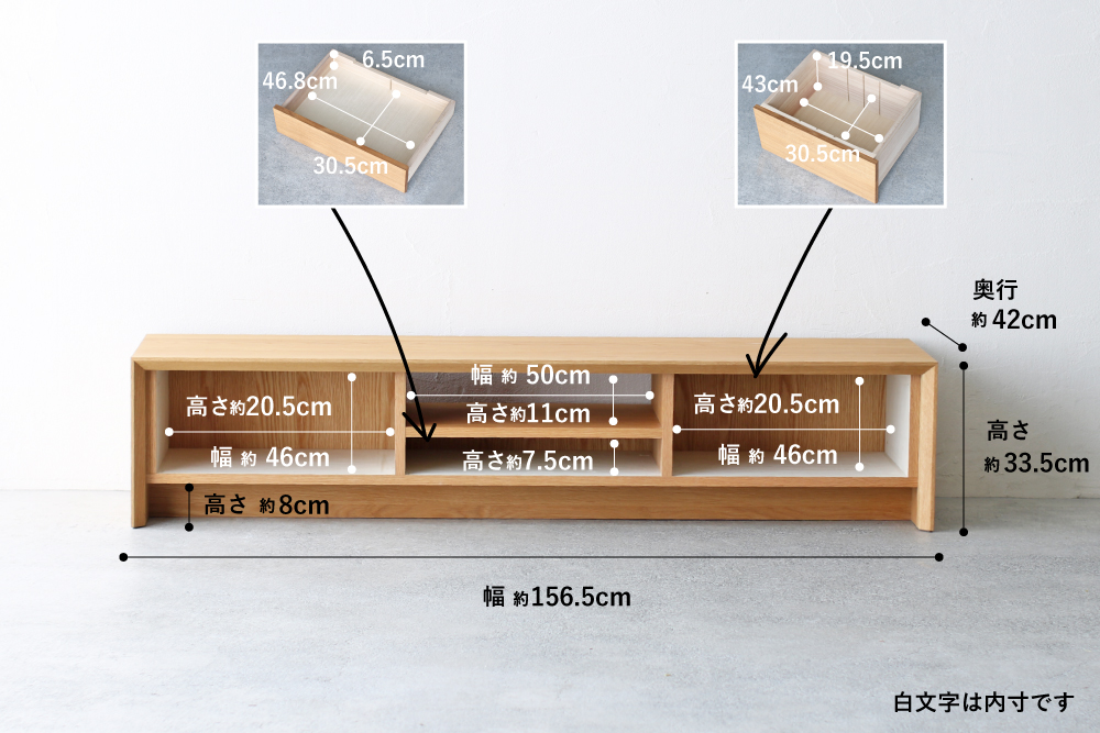 | サイズ | W156.5xD42xH33.5(cm) 左右引き出し内寸:W43×D30.5×H19.5(cm) 開口部内寸:W50×D36.5×H11(cm) 開口部下引き出し内寸:W46.8×D30.5×H6.5(cm) 天板厚:3(cm) |