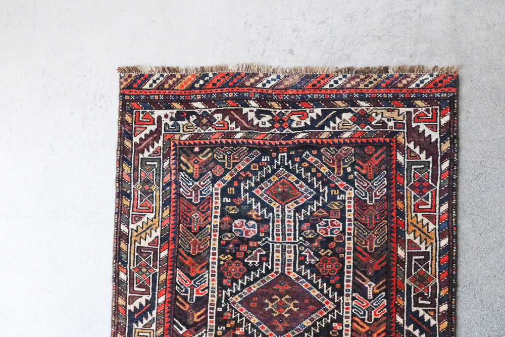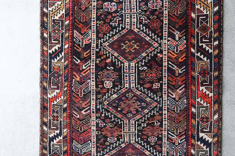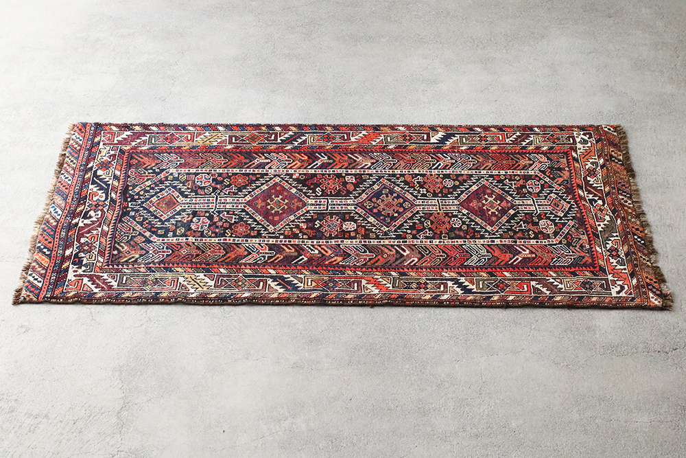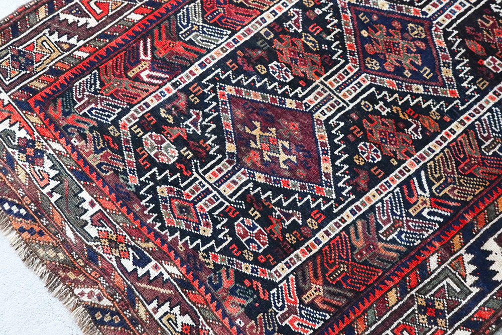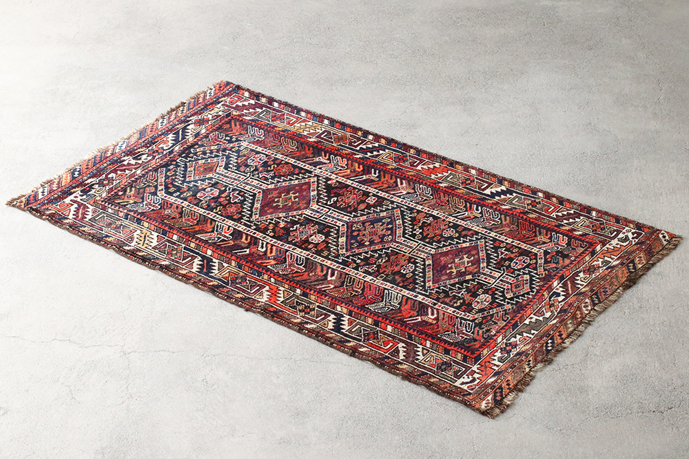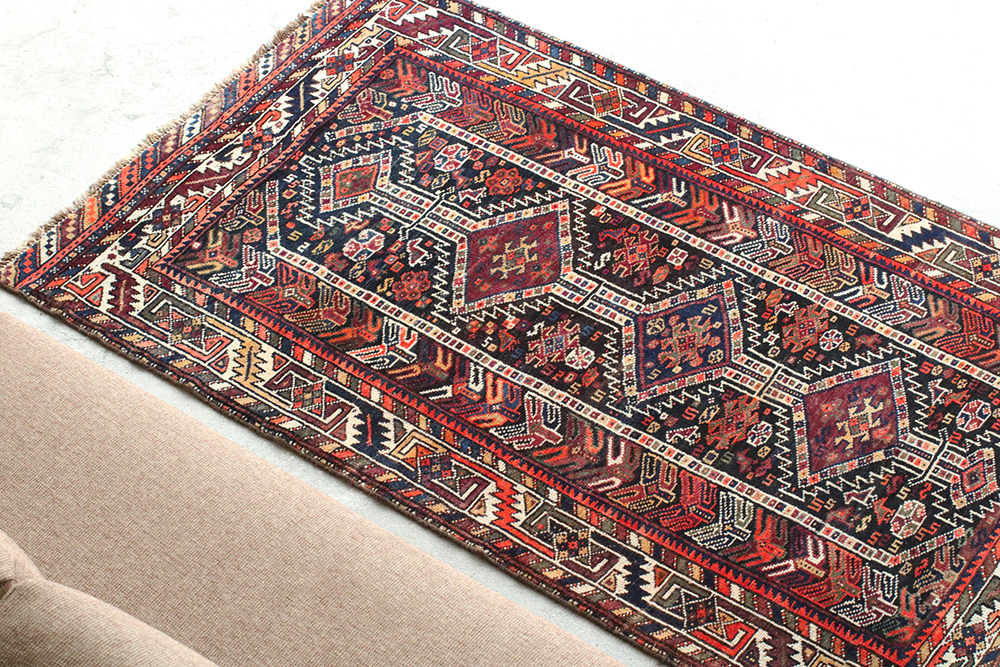 シラーズの絨毯は、カシュガイ族やその他の部族が織る幾何学模様の絨毯。自然からインスピレーションを得たデザインが特徴です。赤やオレンジを基調とした色合いが多く、中央にメダリオン(ひし形や六角形の模様)が配置されるものが特徴です。