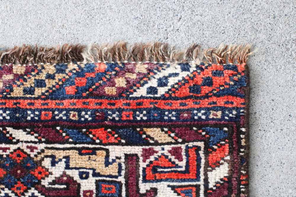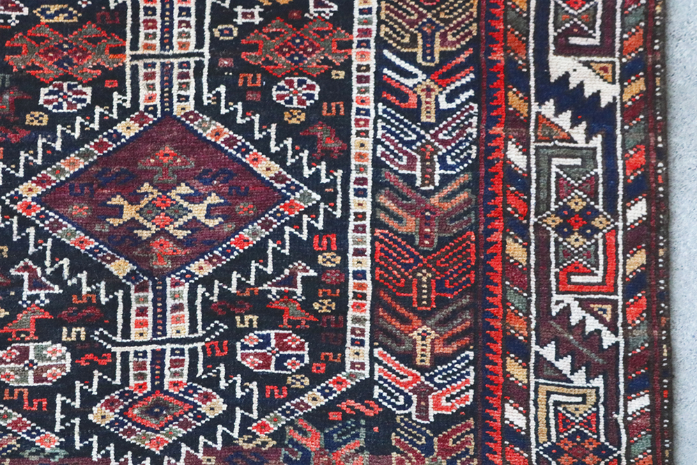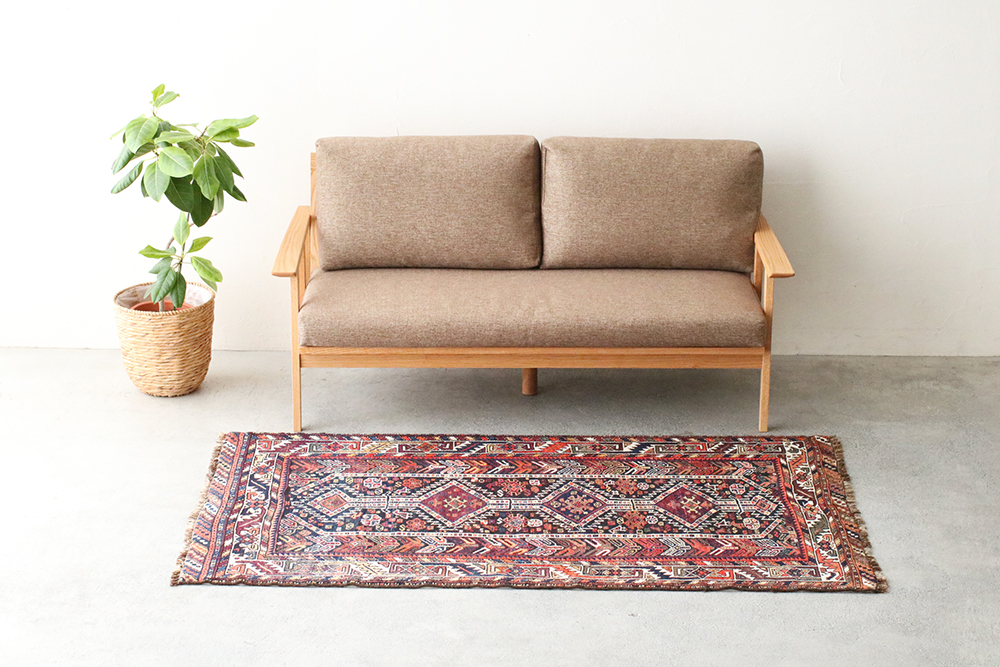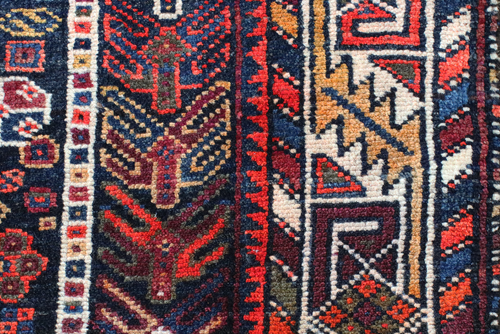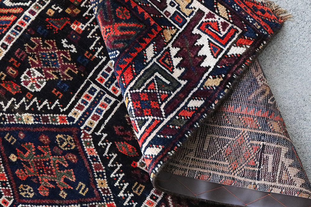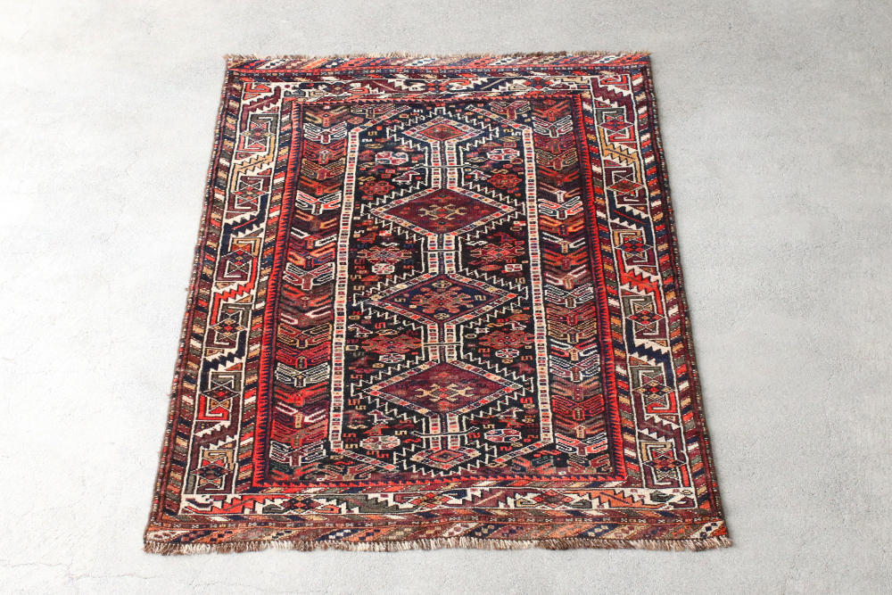 シラーズの絨毯は、カシュガイ族やその他の部族が織る幾何学模様の絨毯。自然からインスピレーションを得たデザインが特徴です。赤やオレンジを基調とした色合いが多く、中央にメダリオン(ひし形や六角形の模様)が配置されるものが特徴です。