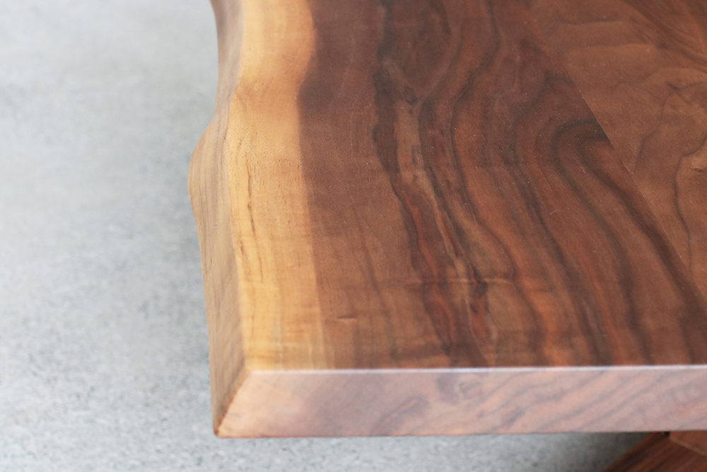 35mm厚の無垢天板は、赤身と白太の色味がコントラストになっておりウォールナットの木目をお楽しみ頂けます。