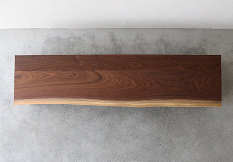 側板と天板のつながりが「門」に似ている為「MON」と名付けられたシリーズの一つです。その側板と天板とのつなぎ目に双方の切断部が見えないよう45度の角度で合わせる「留め」 という手法で作られている為、横から見ても美しい仕上げとなっています。正面からの木目の流れるようなつながりが魅力の一つでもあります。