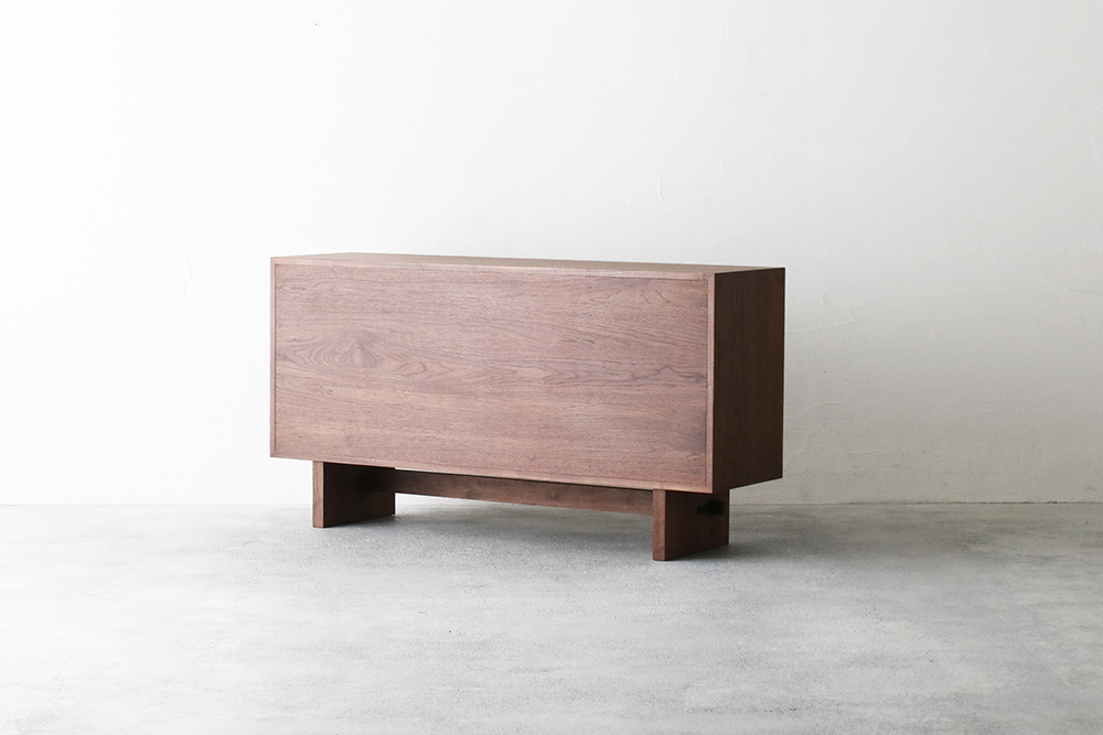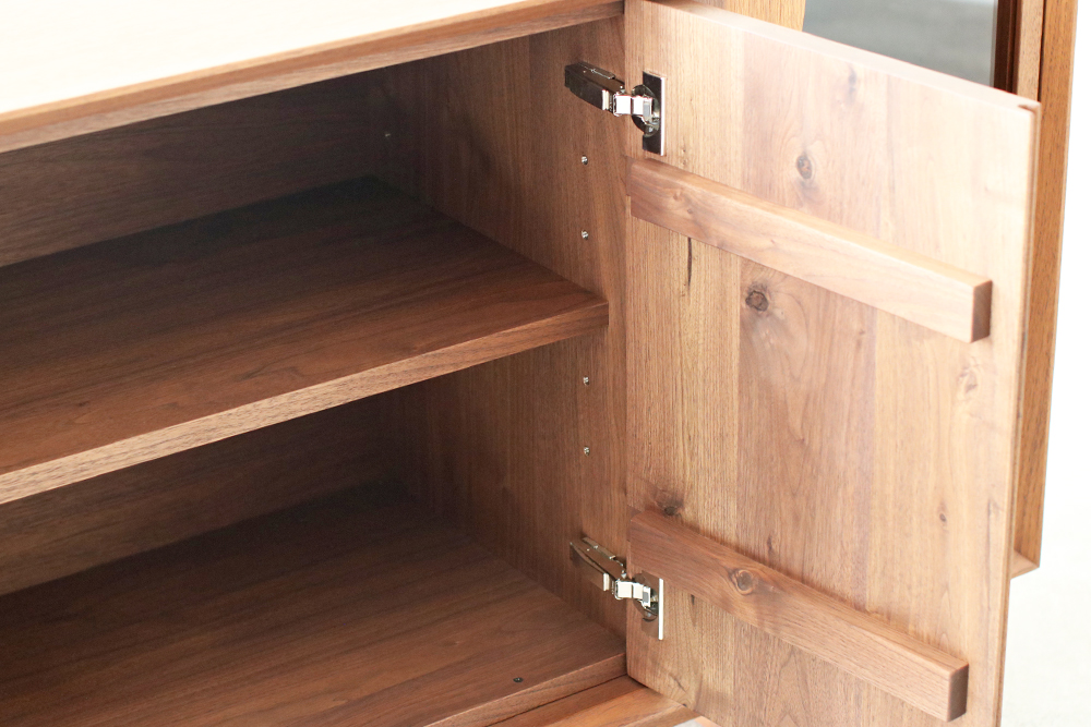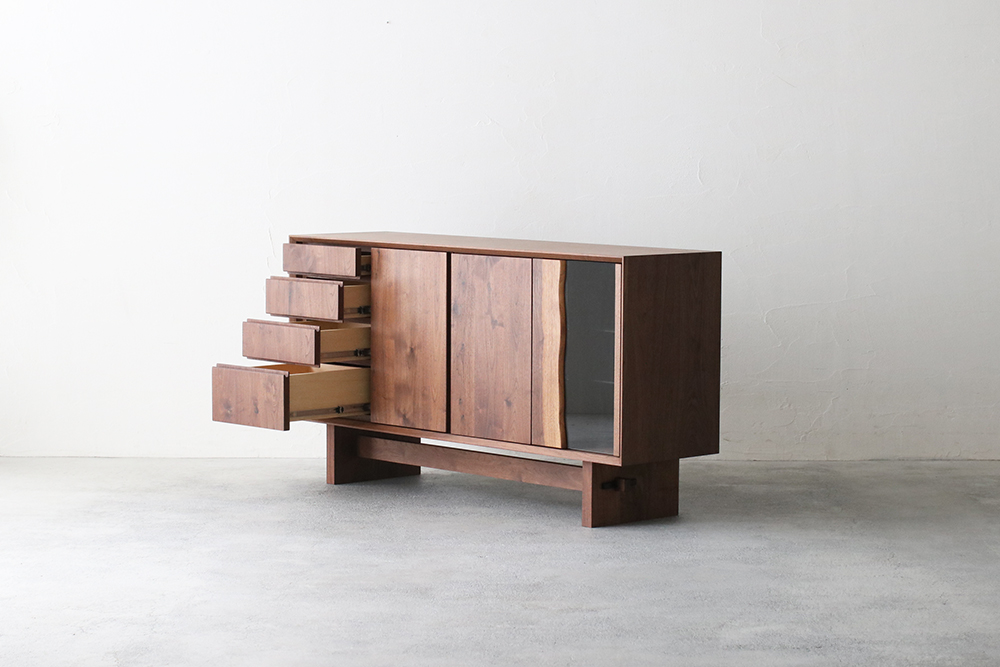 ウォールナット無垢材とガラスのコンビネーションがクールな表情をみせる開き戸収納と、4杯の引出しを兼ね備えた収納力のあるデザインです。