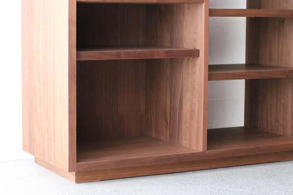 可動式の棚板は4枚ついており、向かって右側は15段階、左側は11段階の高さ調節が可能です。右側は背板がないので、配線がしやすくなっています。