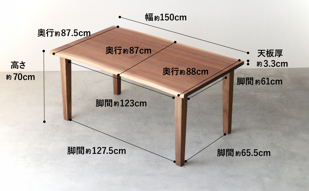 | サイズ | W150×D86〜88×H70(cm) 天板厚:3.3(cm) 脚間:123(cm) |