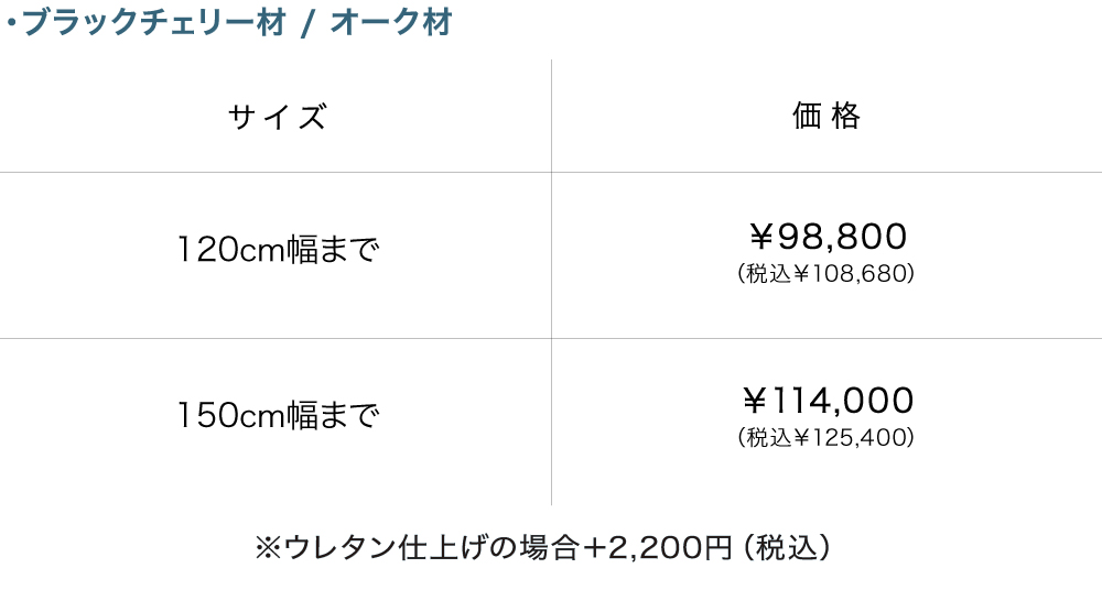 樹種はウォールナット材・ブラックチェリー材・オーク材の3種類から、幅は100cmから150cmまで、塗装はオイル仕上げとウレタン仕上げの2種類からお好みに合わせてお選びいただけます。