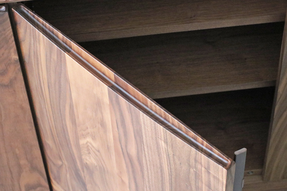 引き出しにもウォールナット材を使用しています。ウォールナット特有の深みのある色合いや節まで使用した美しい木目がキッチンを落ち着いた雰囲気を演出します。