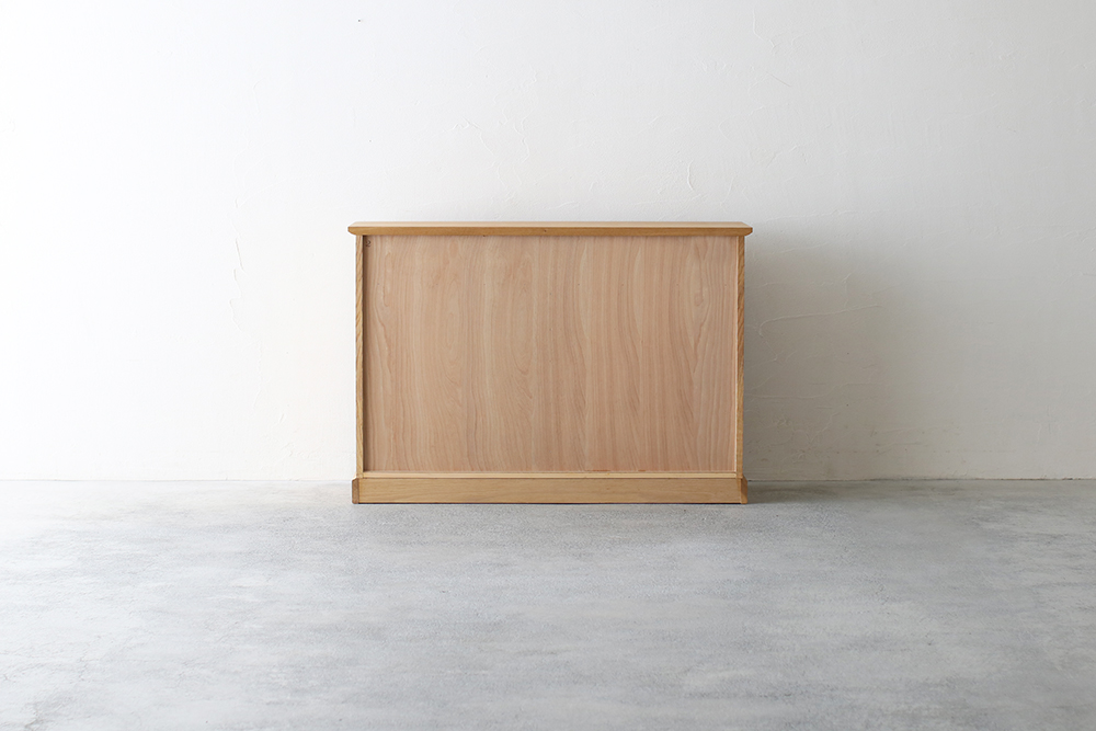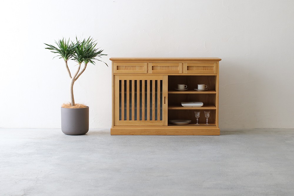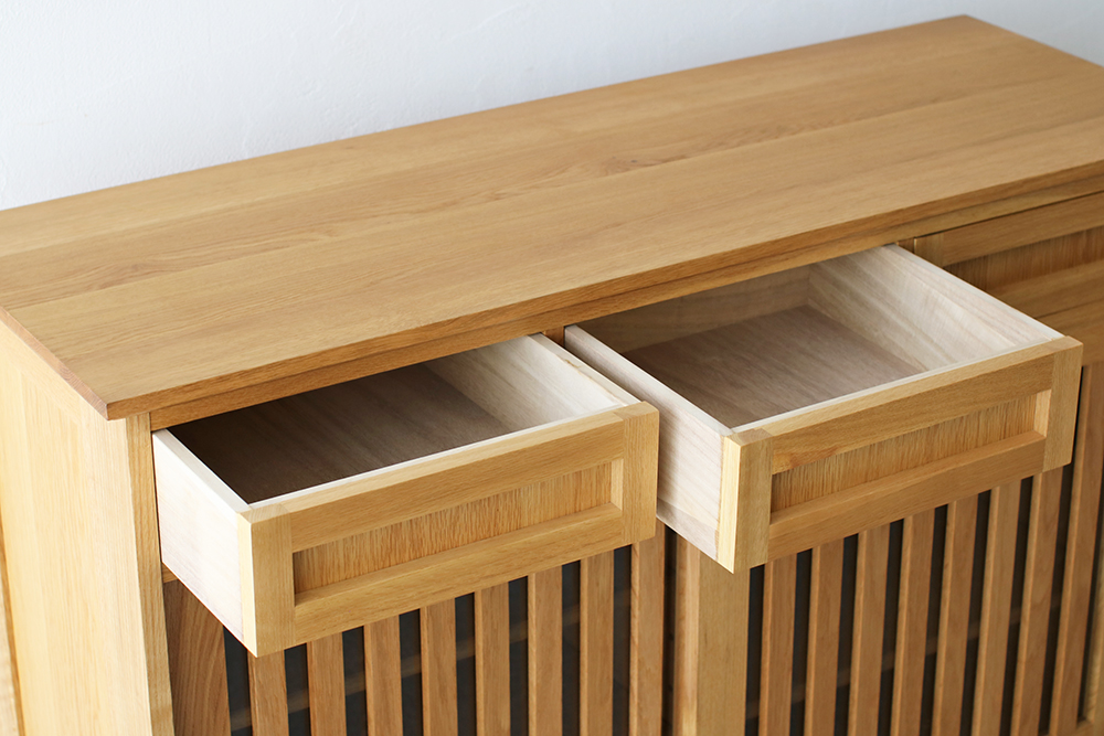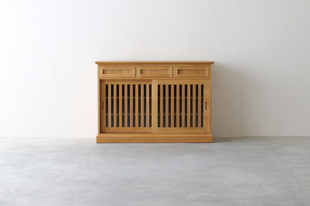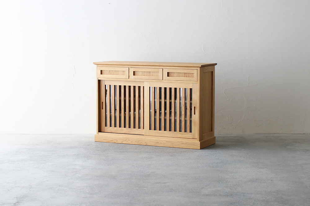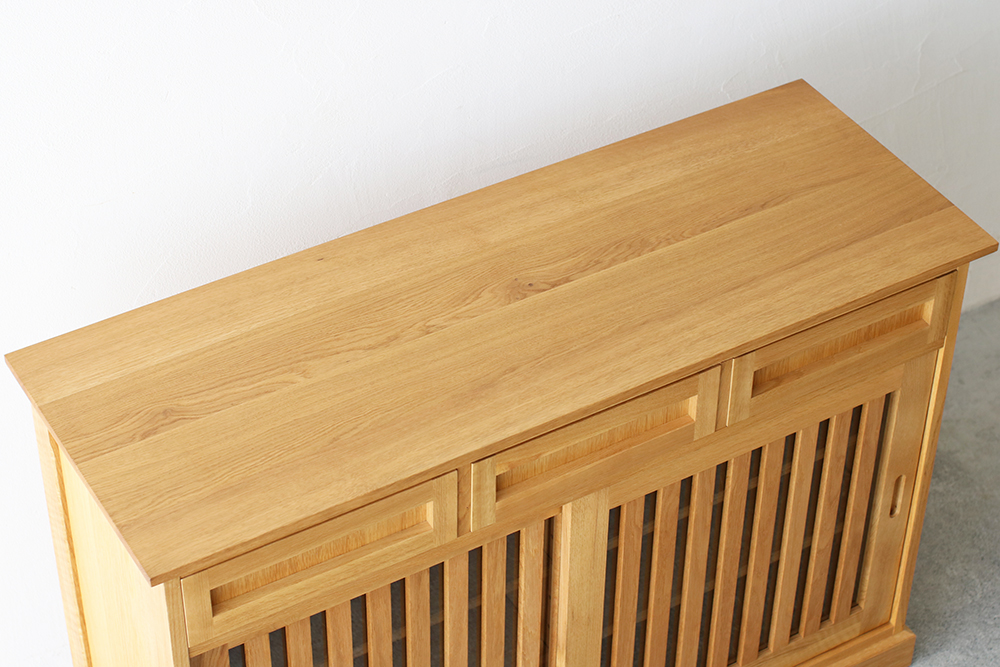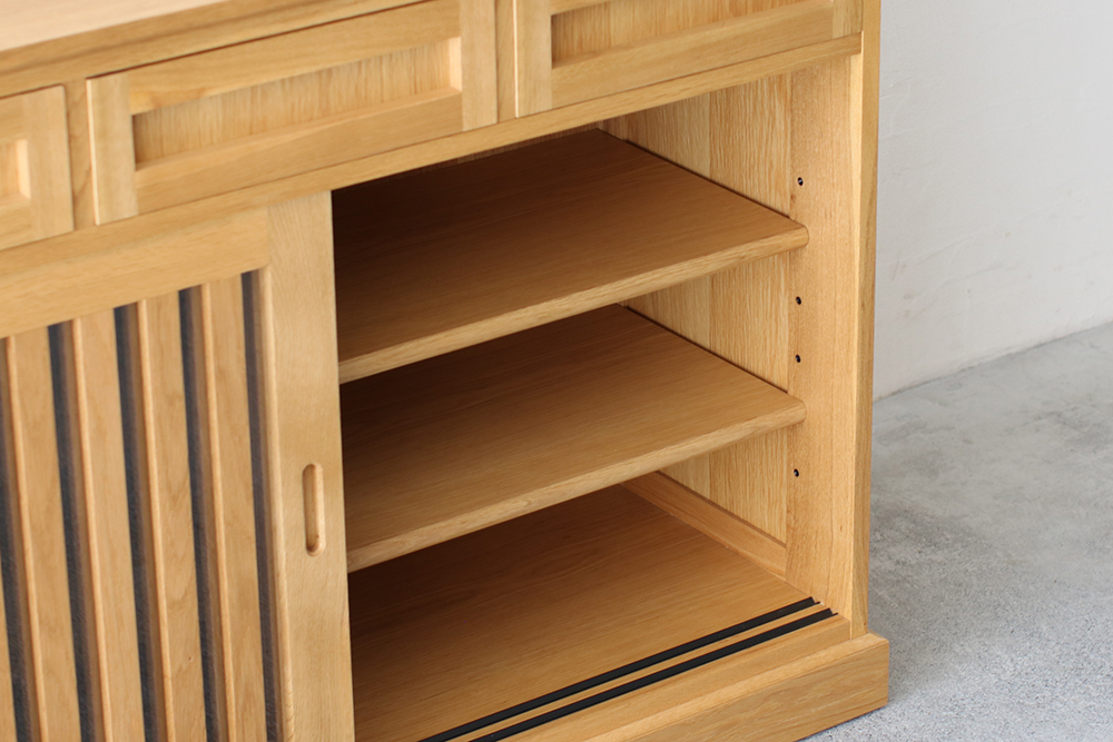 格子・引き出しの前板にはオーク無垢材を使用しています。使い勝手の良い引き戸と繊細な格子を組み合わせ古風な雰囲気ですが、洗練された佇まいは和の空間だけでなく洋の空間にもすんなりと溶け込みます。