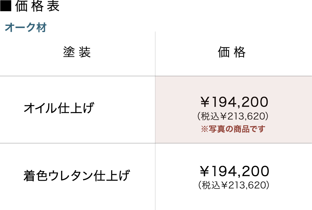 | 塗 装 | オイル仕上げ ※2種類からお選びいただけます。 オイル仕上げ・着色ウレタン仕上げ |