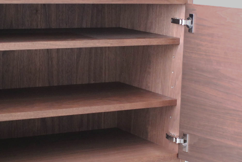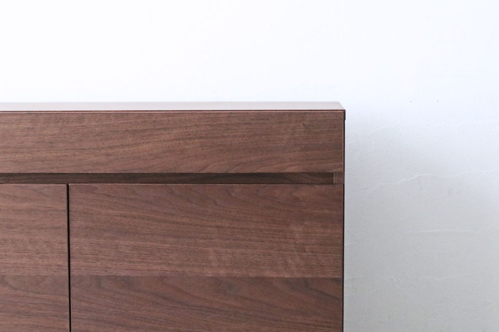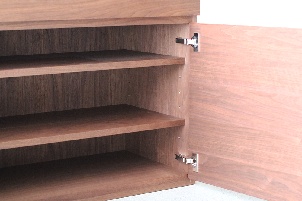 扉や引き出しの持ち手は、扉の上部または引き出しの下部に彫り込まれているので、前から見えず見た目すっきりとした仕上がりです。開き戸内部には、棚板が2枚ついており、6段階に高さの調整が可能です。