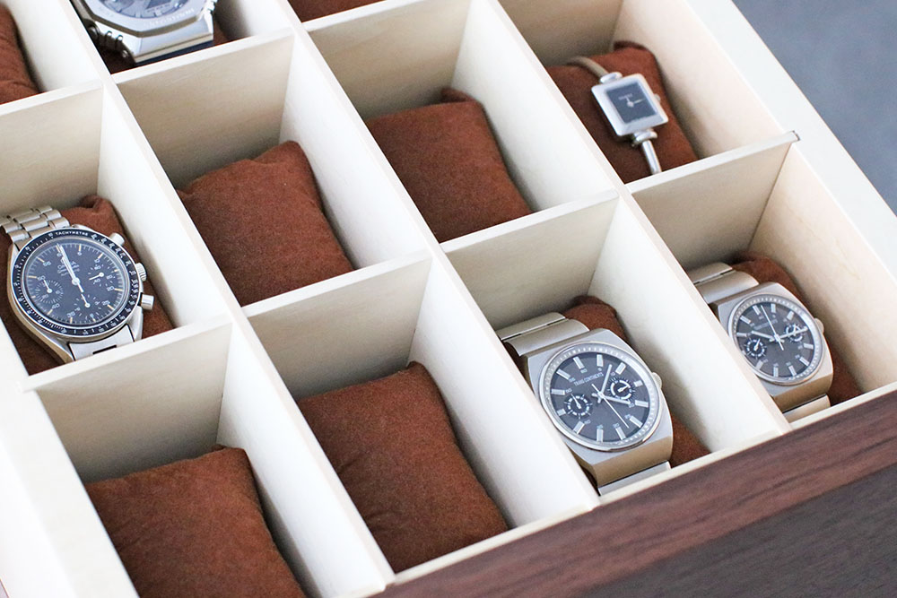 腕時計収納部には、不織布の簡易的なクッションが16個付きます。