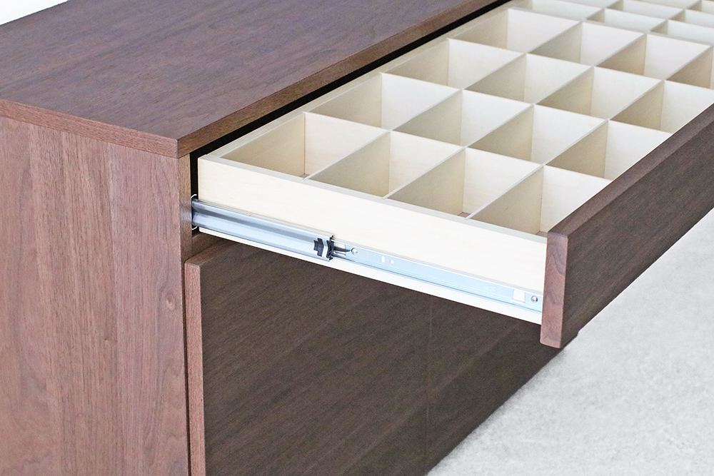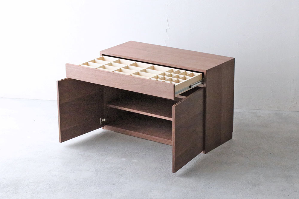 樹種はウォールナット材・ブラックチェリー材・オーク材の3種類からお好みに合わせてお選びいただけます。サイズ変更(幅・奥行・高さ・仕切りの位置)も、承ります。壁にピタリとつけるための「幅木よけ加工」も無料で承ります。