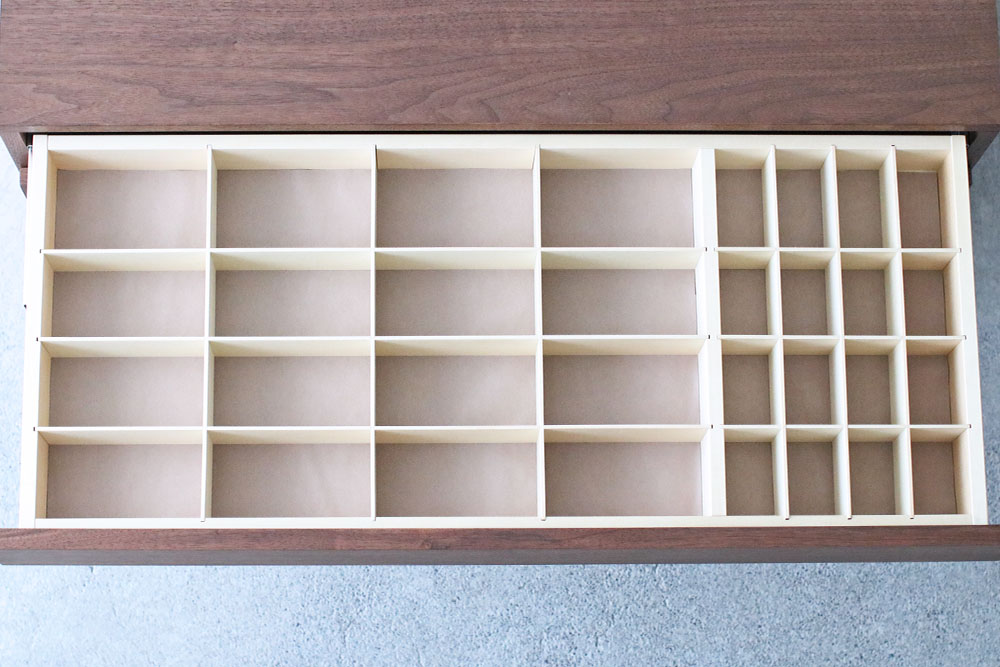 引き出しはスライドレールが付いていますのでスムーズに開閉ができ、仕切られた収納スペースにはアイテムに傷がつかないよう薄い人工スウェードを敷いてあります。お気に入りのアイテムを選ぶ楽しみを味わっていただけます。
