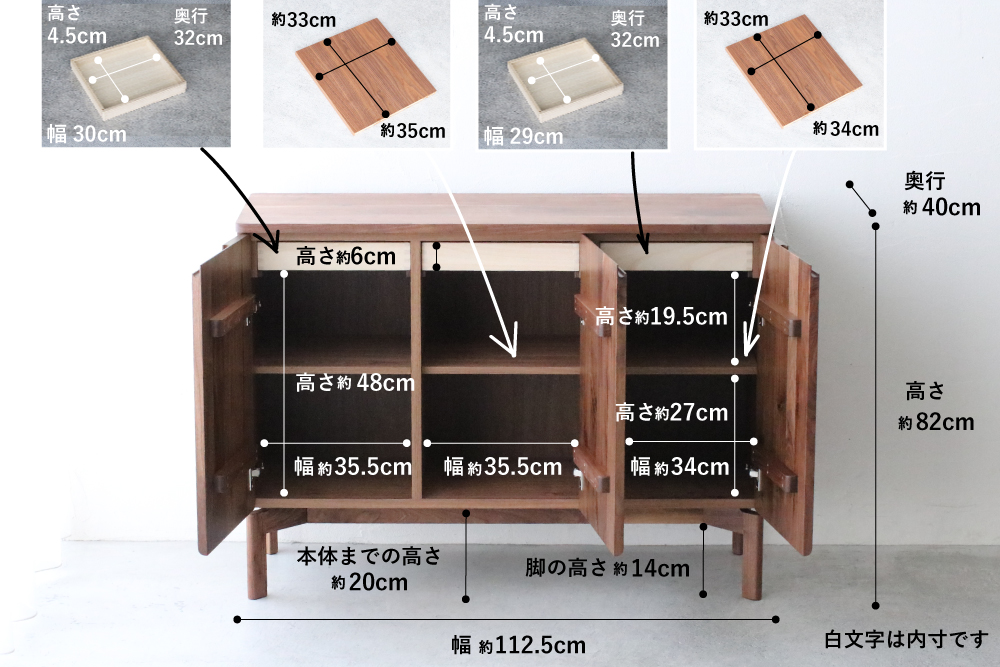 | サイズ | W112.5xD40xH82(cm) 両開き扉内寸:W35.5×D36×H56(cm) 棚板:W35×D33(cm) 引き出し内寸:W30×D32×H4.5(cm) 右片開き扉内寸:W34×D36×H56(cm) 棚板:W34×D33(cm) 引き出し内寸:W29×D32×H4.5(cm) 脚の高さ:14(cm) |