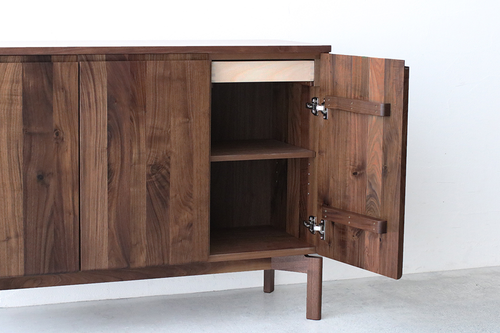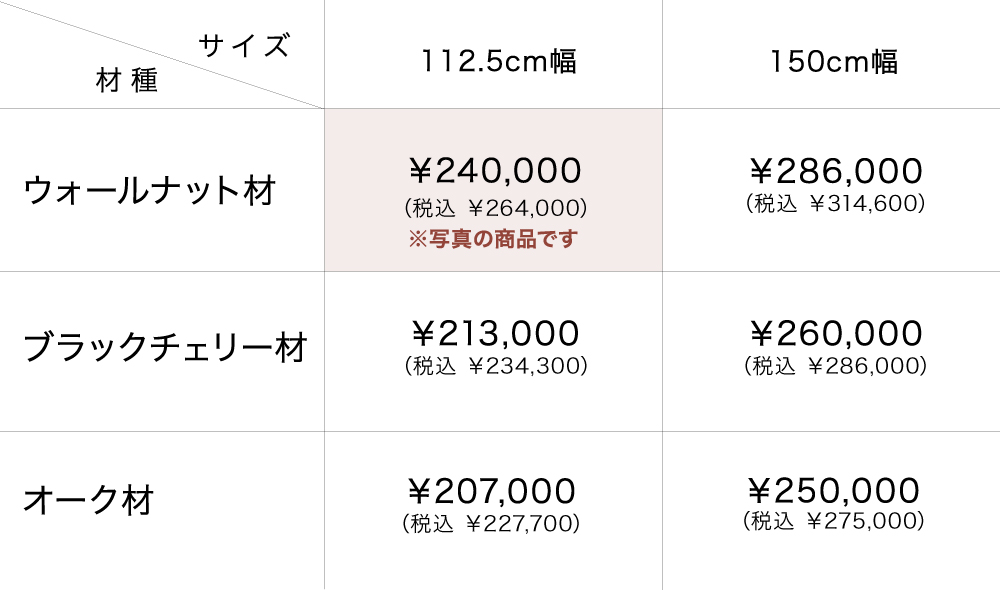樹種はウォールナット材・ブラックチェリー材・オーク材の3種類から、幅は112.5cmと150cmの2種類からお好みに合わせてお選びいただけます。