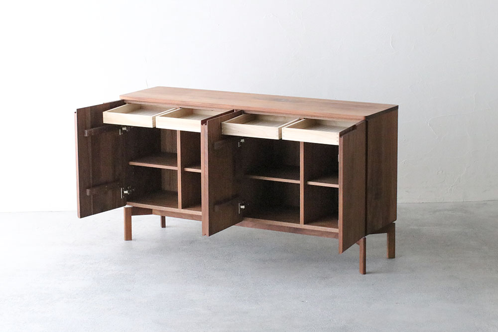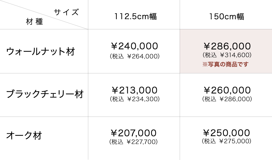 樹種はウォールナット材・ブラックチェリー材・オーク材の3種類から、幅は112.5cmと150cmの2種類からお好みに合わせてお選びいただけます。
