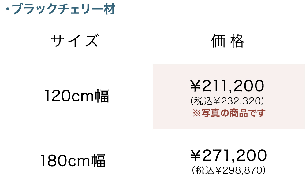樹種はウォールナット材・ブラックチェリー材・オーク材の3種類から、幅は120cmと180cmからお好みに合わせてお選びいただけます。引き手部分はオーク材・ケヤキ材・ブビンガ材・ウォールナット材の4種類からお選びください。
