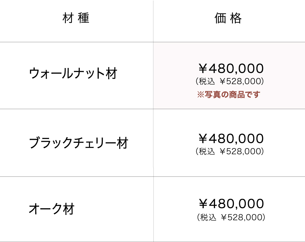 樹種はウォールナット材・ブラックチェリー材・オーク材の3種類からお好みに合わせてお選びいただけます。