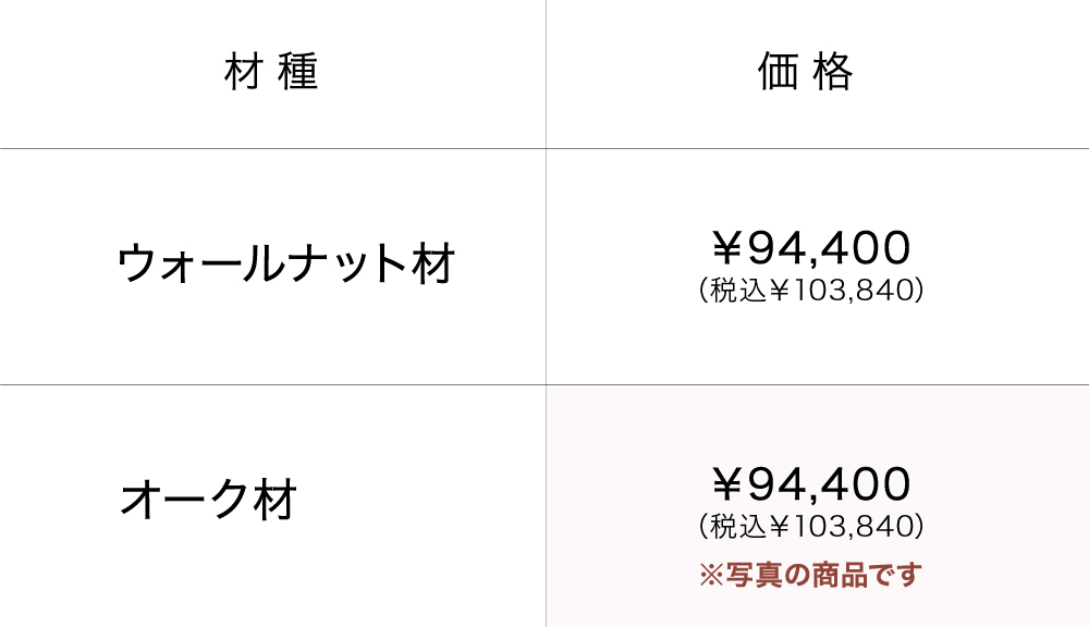 | 素 材 | オーク材 ※2種類からお選びいただけます。 ウォールナット材・オーク材 引き出し内部:桐材 |