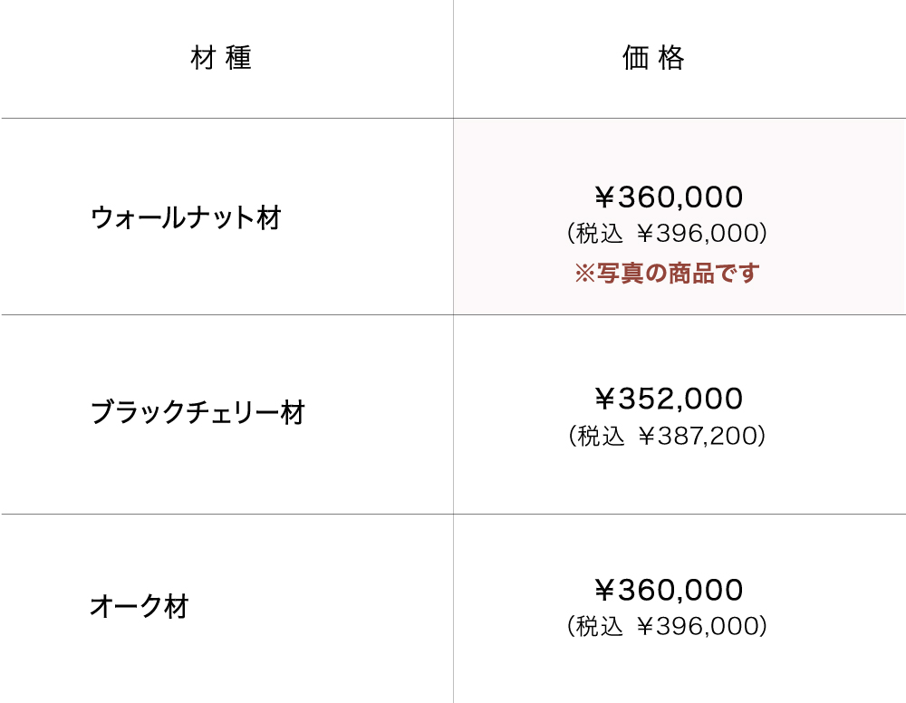 樹種はウォールナット材・ブラックチェリー材・オーク材の3種類からお好みに合わせてお選びいただけます。