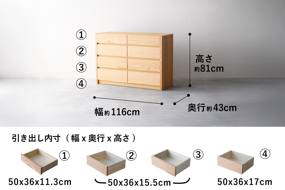 | サイズ | W116xD43xH81(cm) 引き出し内寸: 1段目左右 W50×D36×H11.3(cm) 2・3段目左右 W50×D36×H15.5(cm) 4段目左右 W50×D36×H17(cm) |
